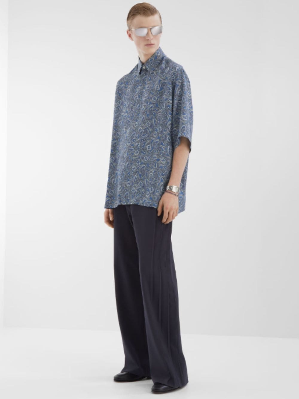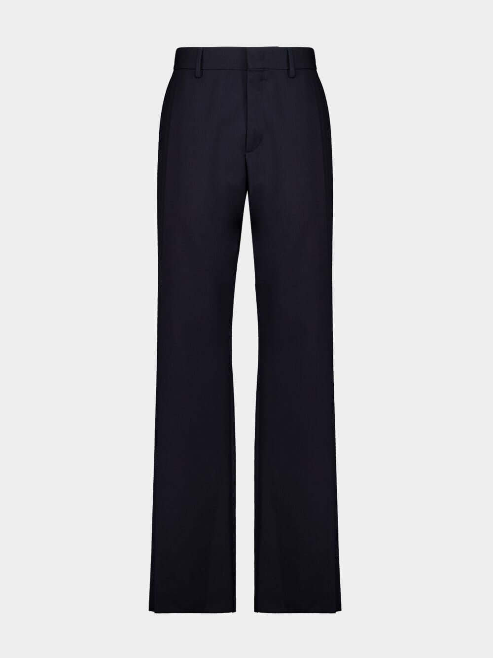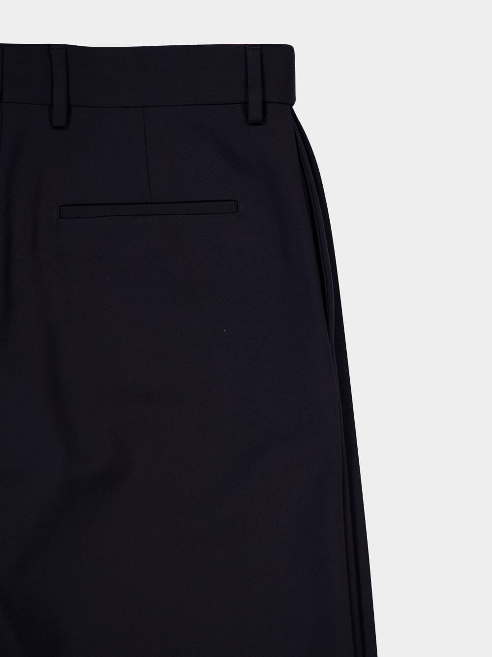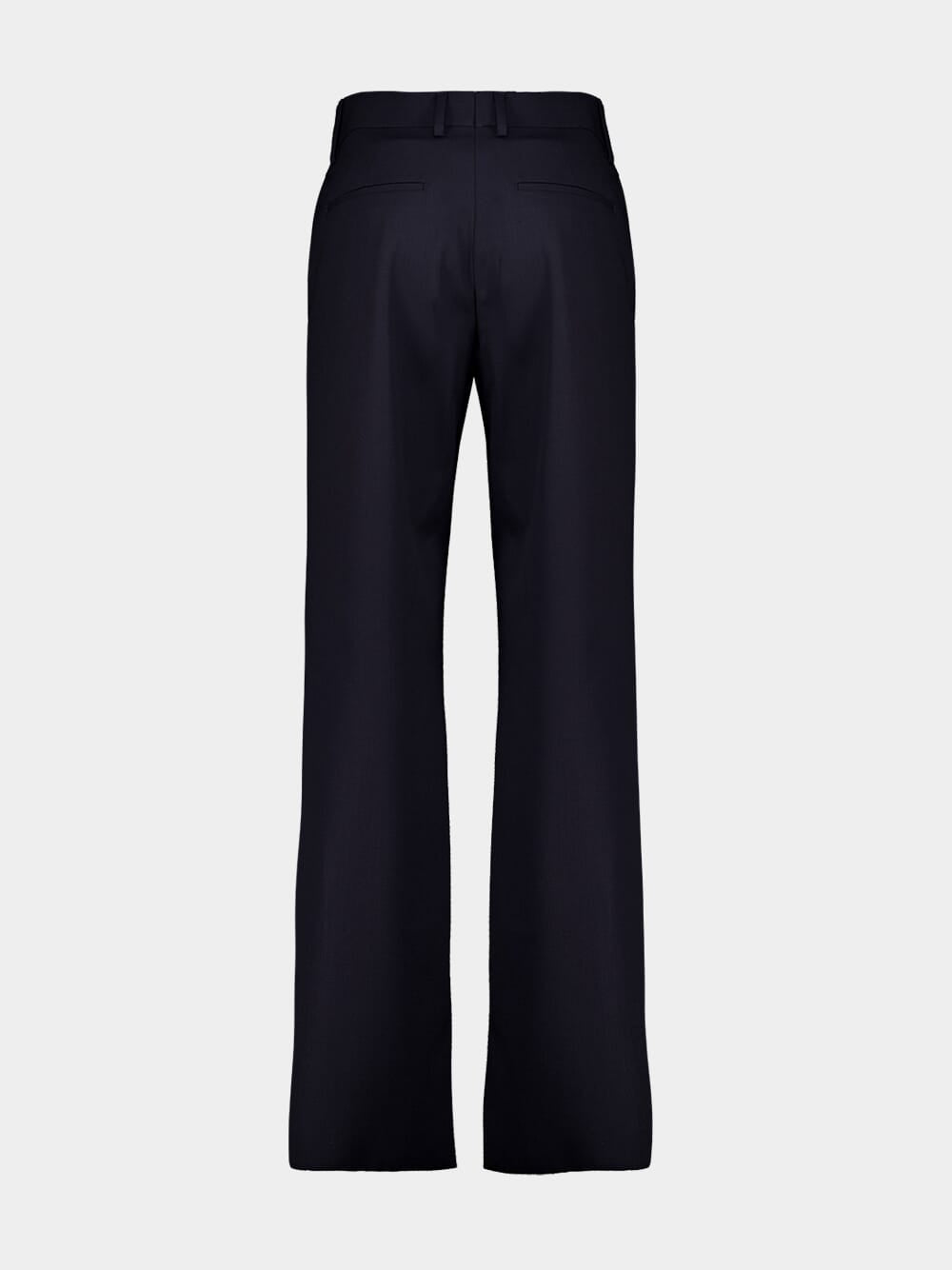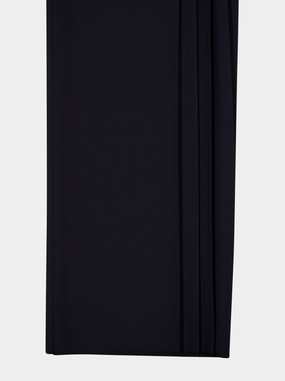 Flowing tailored trousers crafted from luxurious midnight blue wool crêpe. These trousers feature side pockets, welt pockets on the back, and belt loops at the waist for a refined finish. A concealed zip fastening adds to the sleek look, while the symmetric pleated pattern at the hips provides a touch of sophistication. With a hem width of 27.5 cm, they are perfect for a polished, elegant silhouette.