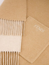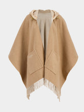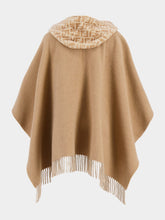 Luxurious wraparound poncho crafted from double cloth in wool and cashmere, featuring two elegant shades of beige. This spacious poncho has a drawstring hood made of sheepskin, adorned with an on-tone FF motif. The pocket is detailed with a contrasting embroidered Fendi logo, and fringes along the hem add a touch of sophistication. Gold-finish metalware completes this refined piece, perfect for adding warmth and style to any outfit.