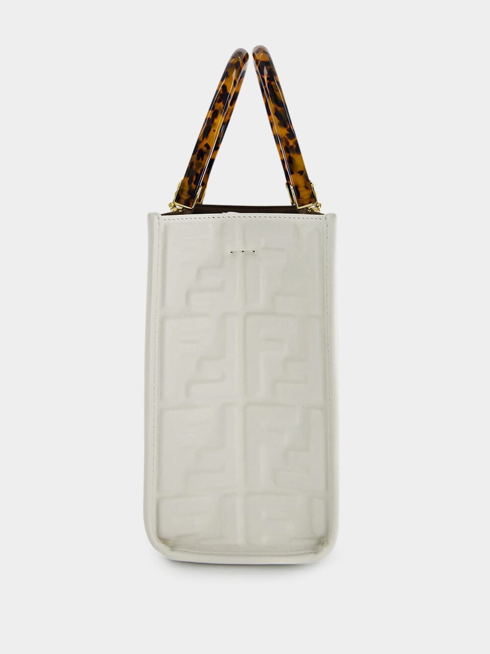 Small Sunshine Shopper Bag, crafted from premium white leather adorned with a raised three-dimensional textured FF motif. The rigid tortoiseshell-effect plexiglass handles add a unique touch to the design. With a spacious lined internal compartment, tone-on-tone leather edges, and gold-finish metalware, this bag combines functionality with luxury. Carry it by hand or effortlessly wear it on your shoulder using the two handles or detachable shoulder strap.