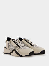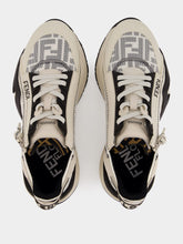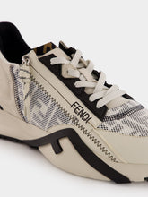 The White Fendi Flow Sneakers redefine modern sportswear with an innovative design. Crafted from white and black FF Lycra®, they feature slip-on functionality with elasticated laces, a side zip, and a corrugated sole adorned with an engraved F. Embellished with white leather and suede details, as well as a brown FF Lycra® tongue, these sneakers exude both style and performance. The Fendi Flow lettering on the heels adds a distinctive touch, while the white rubber soles with black diagonal F details complete the dynamic look. Made in Italy with premium materials.