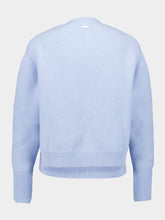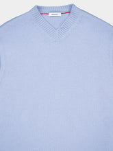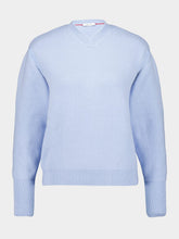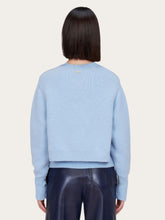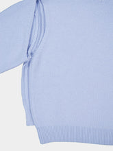 This light blue cashmere sweater offers a creative take on the classic V-neck style with ribbed knit trims and unique layering details. Made from a soft and snuggly cashmere blend, it features a sleeveless tank top combined with a cropped cardigan design, complete with shoulder slits and a two-length layering look at the back.