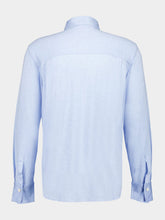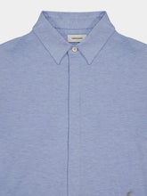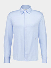 This refined light blue jersey shirt combines comfort and sophistication, crafted from smooth, stretchy viscose. The clean-cut design features a pointed collar, concealed button placket, and double-height cuffs with slits and a diagonal eyelet. Soft folds on the back yoke add subtle volume, while the asymmetric hem with rounded side vents lends a modern touch. Completed with delicate embroidery above the waist, this Italian-made shirt is perfect for versatile, polished styling.