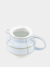 The New Diva collection's porcelain teapot, featuring the iconic Colonna shape, showcases a sky-blue decoration enriched with distinctive gold threading. This piece complements the tea service, including the sugar bowl, milk pitcher, cups, and plates, all designed to coordinate with the collection’s other colors. Effervescent and sophisticated, Diva reimagines the allure of 1950s design in a contemporary context. The collection offers a versatile assortment of tableware with stackable elements that can be arranged in symmetrical compositions for easy storage.