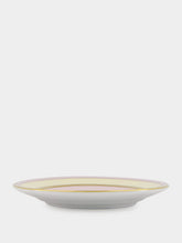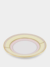 The New Diva collection's porcelain coffee saucers feature a radiant yellow motif with luminous gold threading, reflecting the vibrancy of 1950s Italian design. These saucers perfectly complement the coffee service, including coordinating mugs, coffeepot, sugar bowl, and milk pitcher. With other pastel colors available for mixing and matching, they add a personal touch to a distinctive set. Inspired by Giovanni Gariboldi's iconic Colonna shapes, Diva combines mid-century elegance with clean lines and functional design, making it a standout choice for any setting.