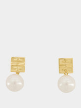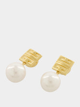 Elegant and timeless, these Gold 4G Earrings from Givenchy feature a golden-finish metal with a lustrous resin pearl drop. Part of the iconic 4G line, these stud earrings showcase the signature 4G emblem with a refined pin clasp and push-button fastening for secure wear. Engraved with the GIVENCHY logo on the back, this piece blends luxury with classic sophistication, perfect for any occasion.