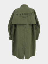 This khaki cotton parka from Givenchy features a crinkled texture and a relaxed cocooning silhouette. Designed with a stand-up collar, front flap pockets, and a drawstring hem for a custom fit. The back is adorned with a tonal GIVENCHY Stamp print, adding refined branding. Finished with a zip and snap closure and buttoned cuffs, it delivers utilitarian elegance with signature Parisian flair.