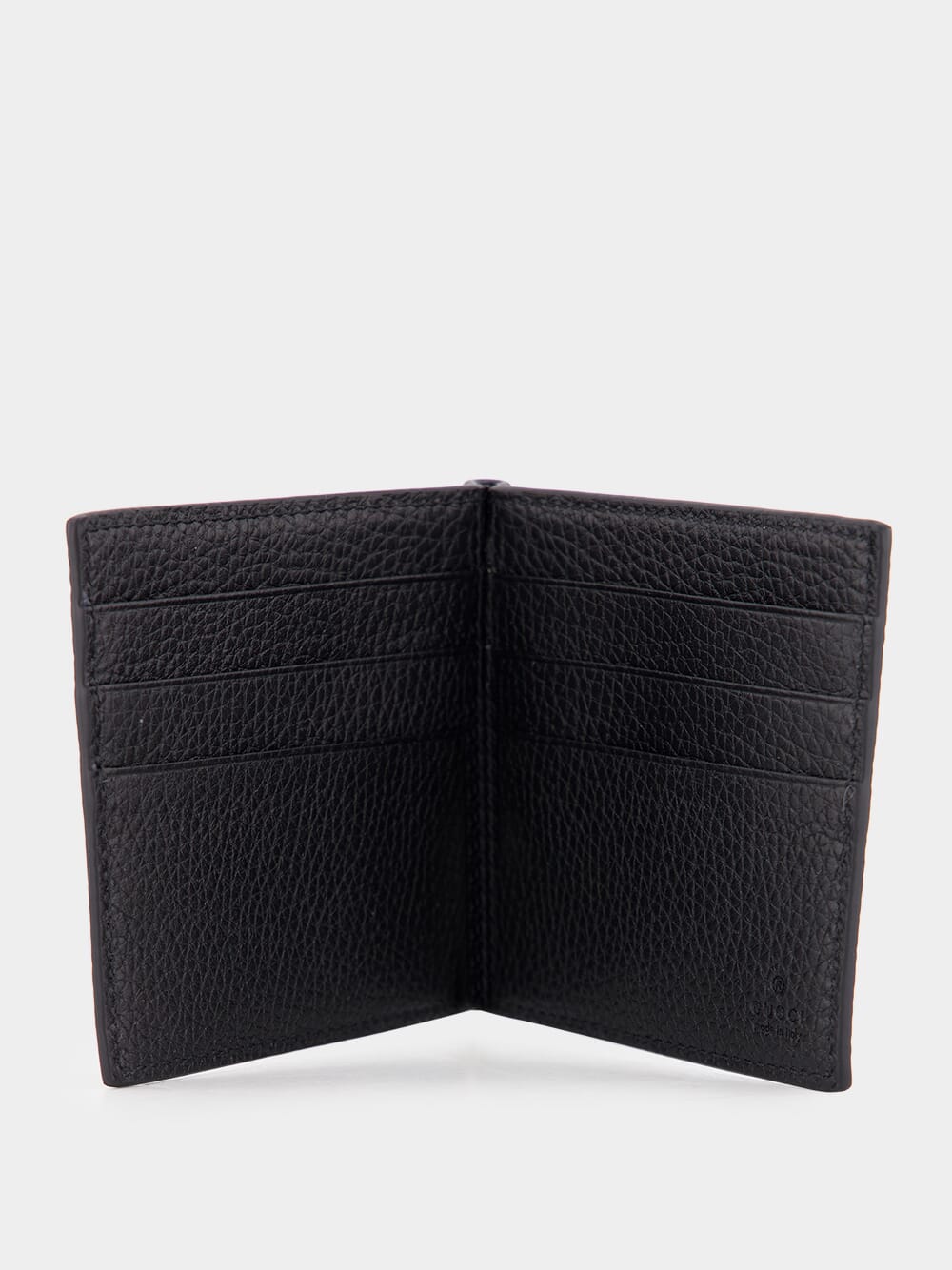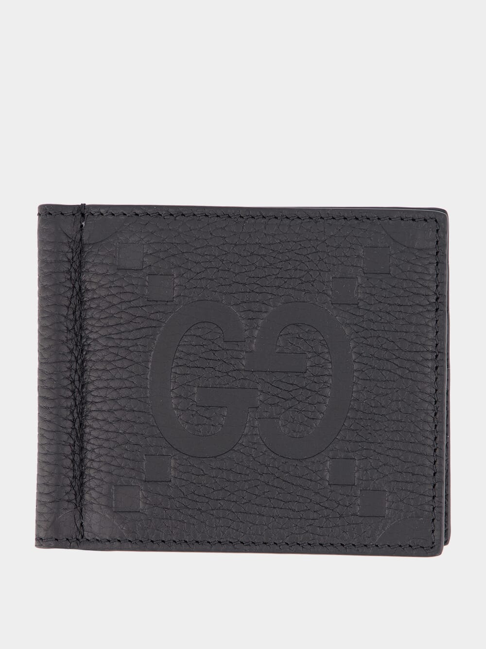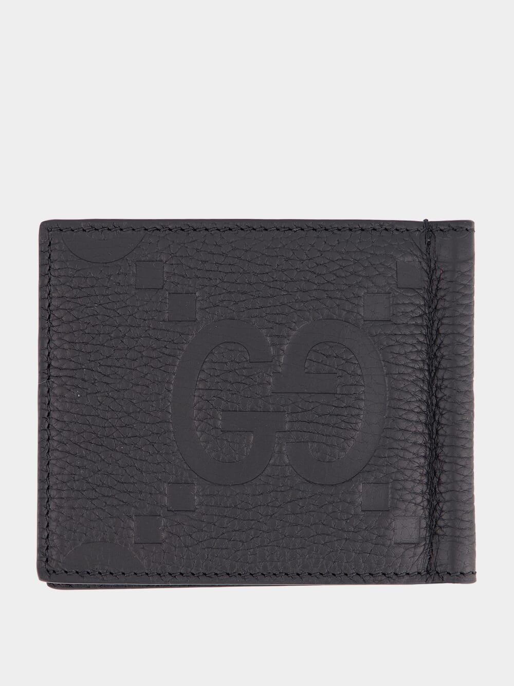 The all-black jumbo GG design from Gucci returns for Pre-Fall 2023 atop a selection of small leather pieces. Featuring a reinterpretation of Guccio Gucci's initials, this emblematic leather money clip offers six card slots and an interior money clip. The moiré lining adds a luxurious touch to this practical and stylish accessory.