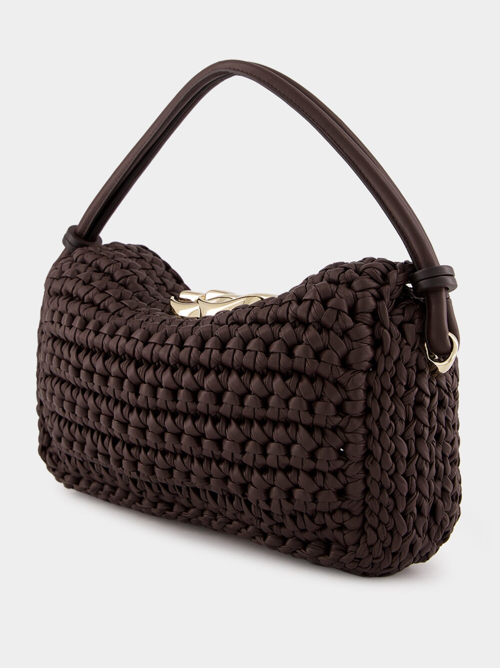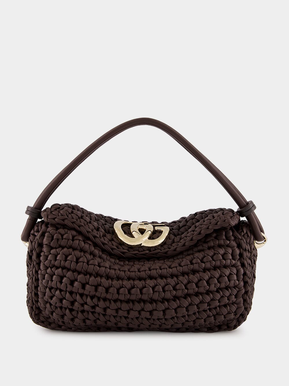 This small top handle bag presents an essential shape, crafted from brown soft crochet leather, and features a magnetic snap closure under the flap. The light gold-toned Double G hardware adds a touch of luxury to the minimalistic silhouette, making it a versatile accessory that complements various looks. Unlined for a natural finish and made in Italy, this refined piece combines elegance with practicality.