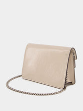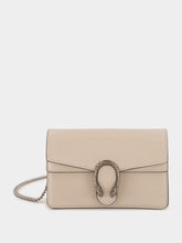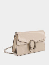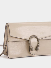 The Dionysus Super Mini Bag in light grey patent leather brings a contemporary edge to its iconic design. Featuring a high-shine finish that contrasts beautifully with the silver-toned tiger head hardware, this compact accessory offers both style and functionality. The suede leather lining adds an elegant touch, while the push lock closure ensures security. With a versatile chain strap, this bag can be worn over the shoulder or cross-body. Ideal for carrying essentials such as an iPhone Plus, AirPods, a card case, and lipstick.