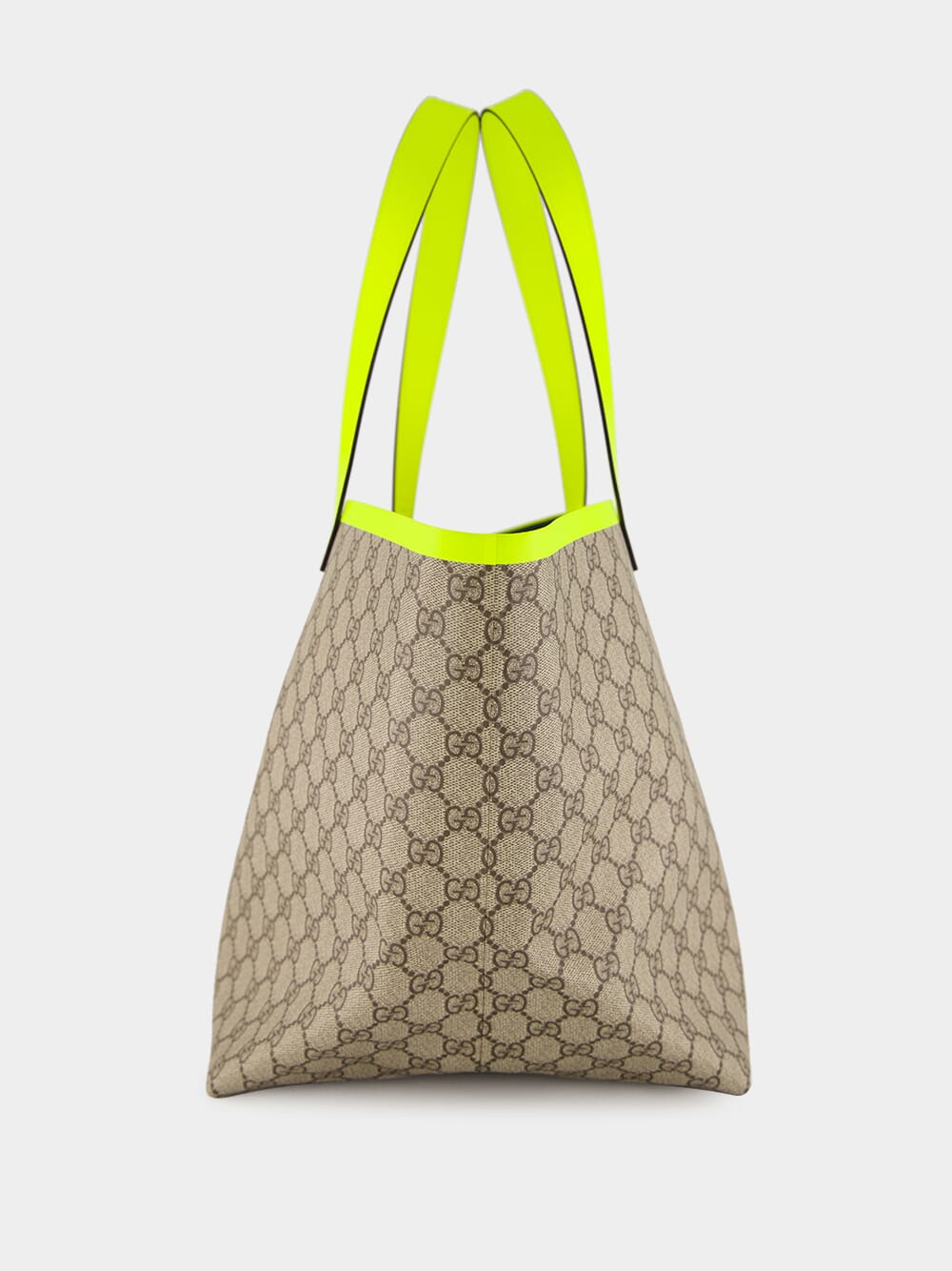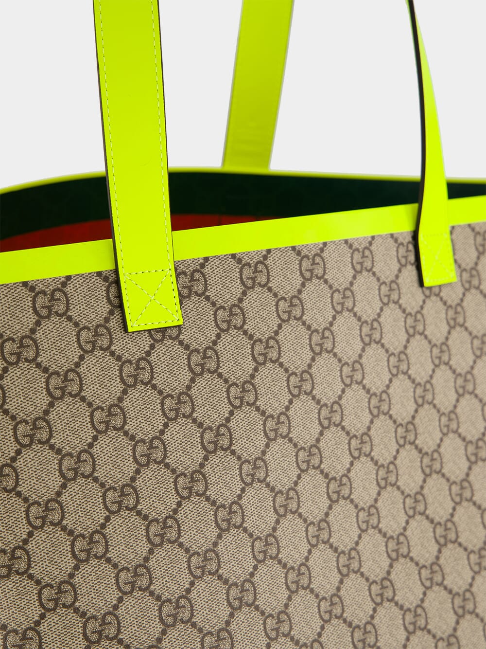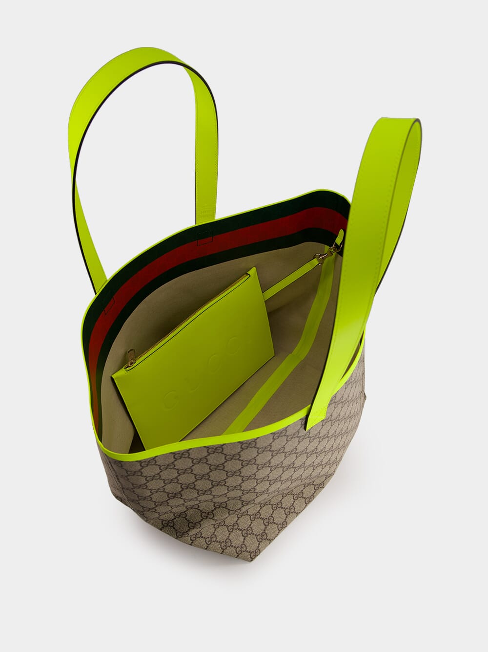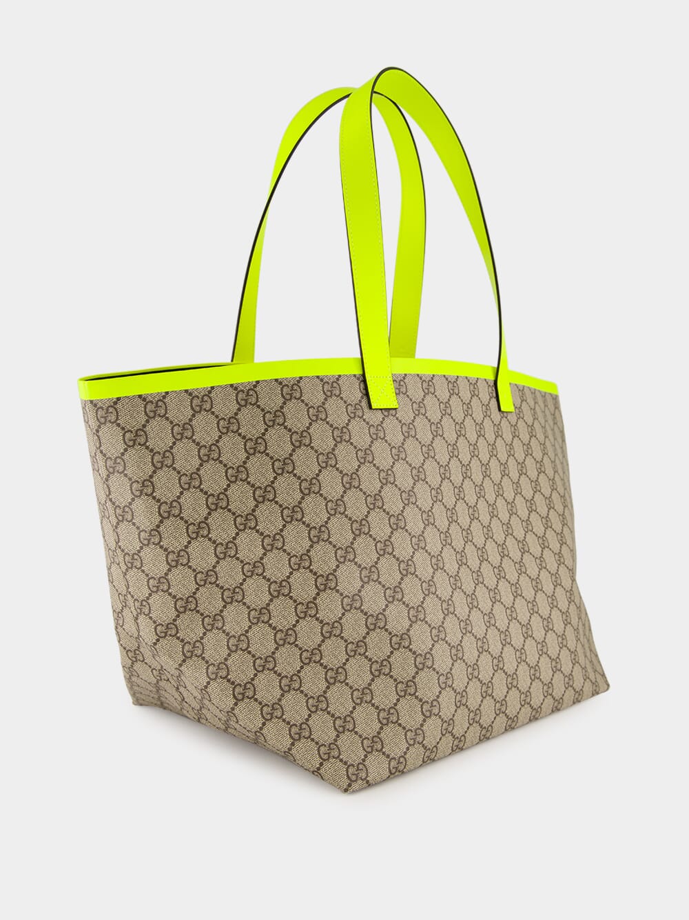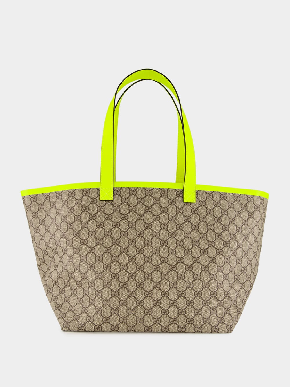 The Totissima Medium Tote Bag from Gucci Lido is inspired by the vibrant summer spirit and beach clubs of the Italian coast. Crafted from beige and ebony GG Supreme canvas, it features neon green leather trim for a contemporary touch. The tote includes a matching detachable pouch and an internal Web stripe, expertly crafted for seamless design. Ideal for the city, poolside, or beach, this versatile tote brings a pop of color to any outfit.