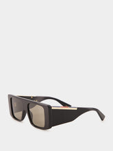 The Cruise 2025 eyewear collection features bold rectangular sunglasses crafted with a shiny black acetate frame and temples. The wide temples showcase a discreet Gucci logo and Web detail, while the solid grey lenses offer 100% UVA/UVB protection. A contemporary design with timeless elegance, finished with a Gucci Rosso Ancora red case.