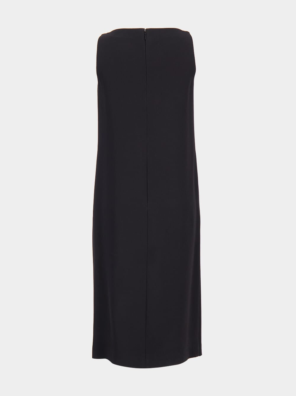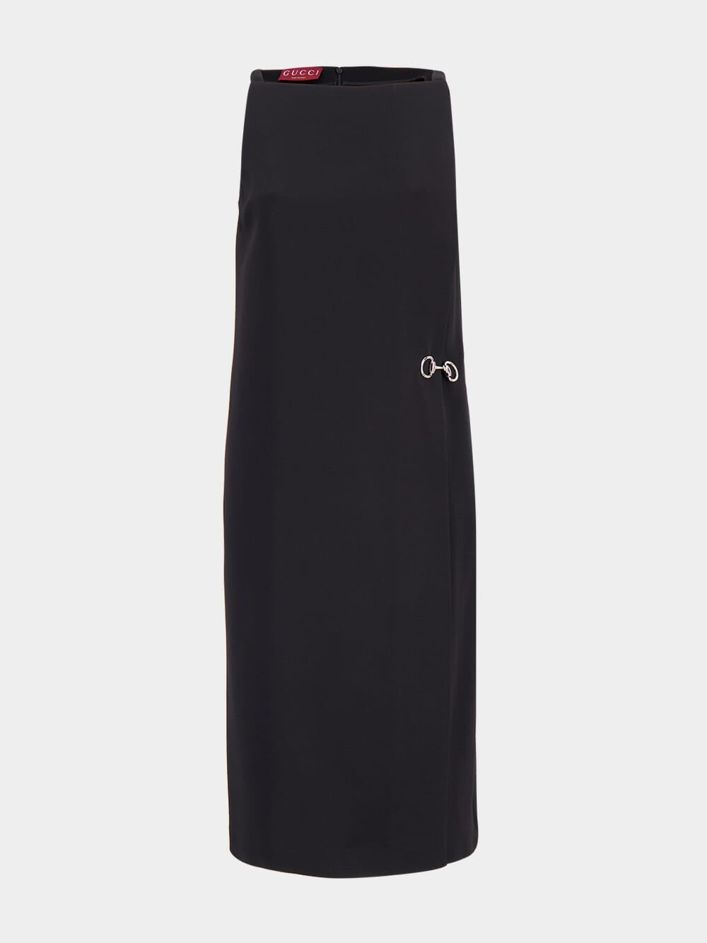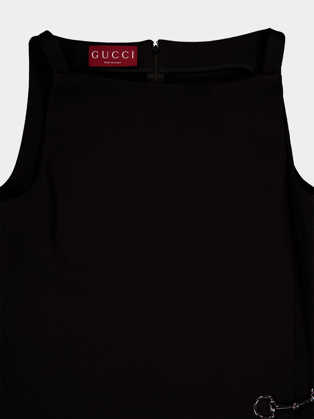The Gucci Cruise 2025 collection showcases minimalist elegance with its monochromatic designs. Crafted from heavy viscose sable, this black boat neck dress exudes sophistication. Featuring a sleek silhouette with a Horsebit detail on one side, it is complemented by practical side pockets and a hidden zip closure. Perfect for a variety of occasions, the unlined construction ensures a fluid and refined fit.