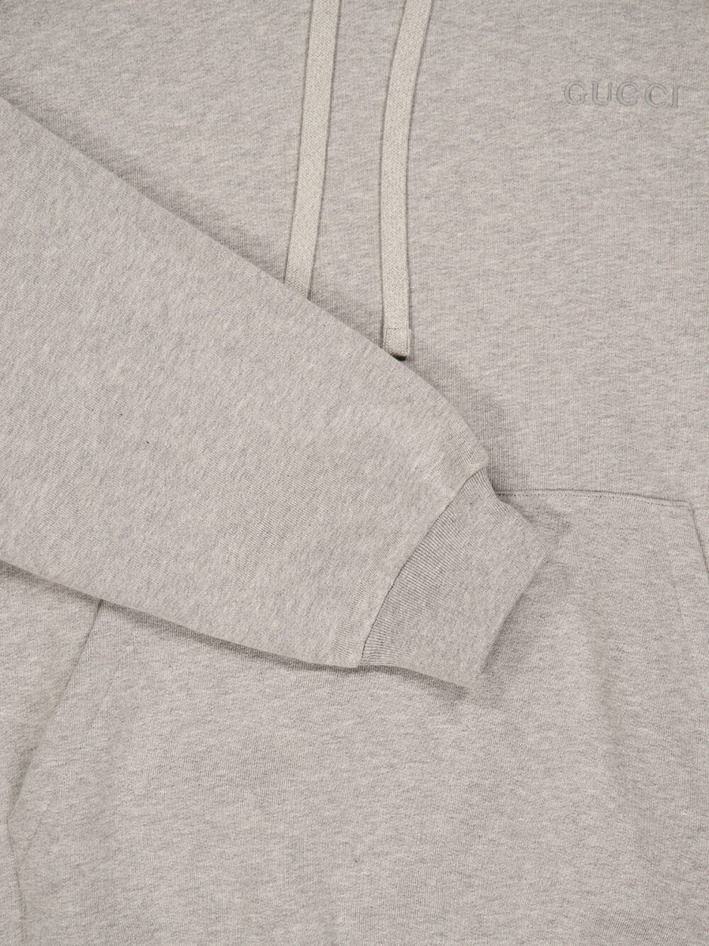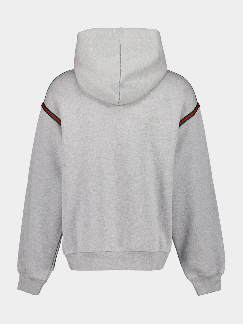 Crafted from brushed cotton jersey, this grey mélange hooded sweatshirt brings comfort and sophistication to casual wear. Featuring Gucci embroidery and a green and red Web trim, it is completed with ribbed finishes and a kangaroo pocket.
