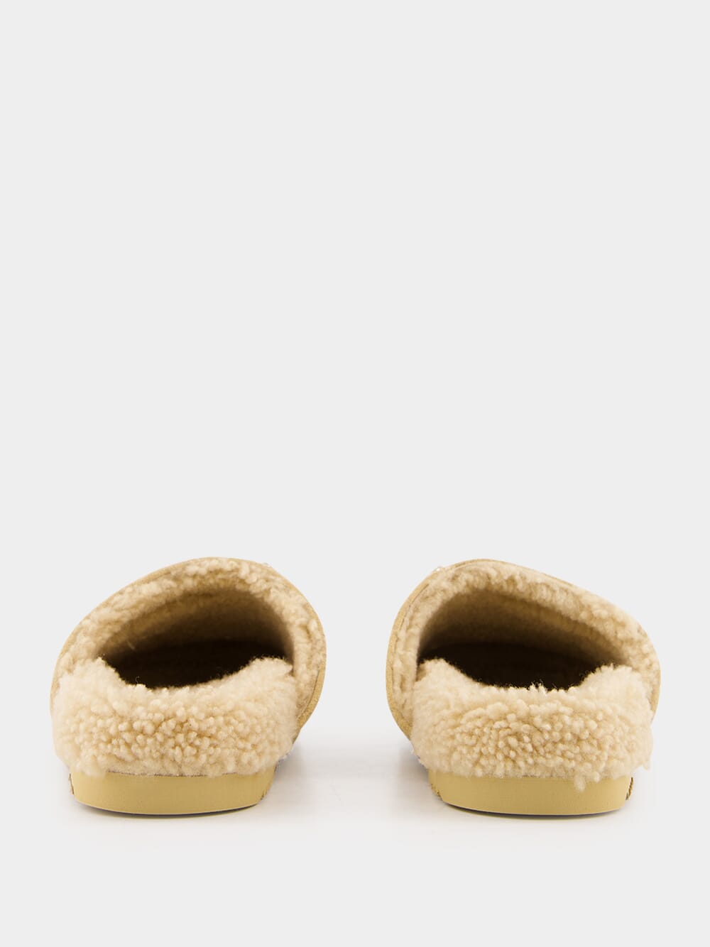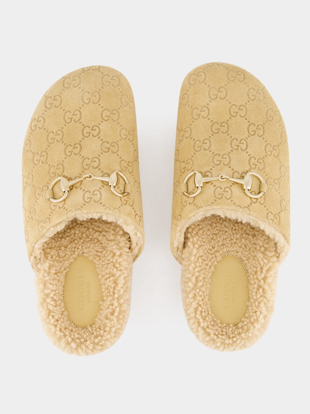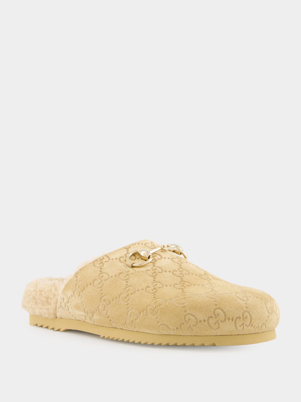 This women's slip-on mule showcases the House's signature GG suede in beige, paired with light gold-toned Horsebit hardware. The comfortable silhouette is lined with soft Merino wool, providing warmth for cooler days, and features a rubber sole with a round toe for casual elegance. A timeless flat style with a 5mm height, perfect for a chic, laid-back look.