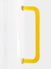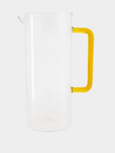 This elegant tube jug, featuring a vibrant yellow handle, is meticulously hand-made and flame-worked. The clear glass body highlights the sleek design and impeccable craftsmanship, making it an ideal piece for serving beverages in a modern kitchen or dining setting. The yellow handle adds a pop of color and ensures a comfortable grip, while the lightweight yet durable construction ensures practical use. Perfect for daily use or special occasions, this jug seamlessly blends functionality with contemporary aesthetic appeal.