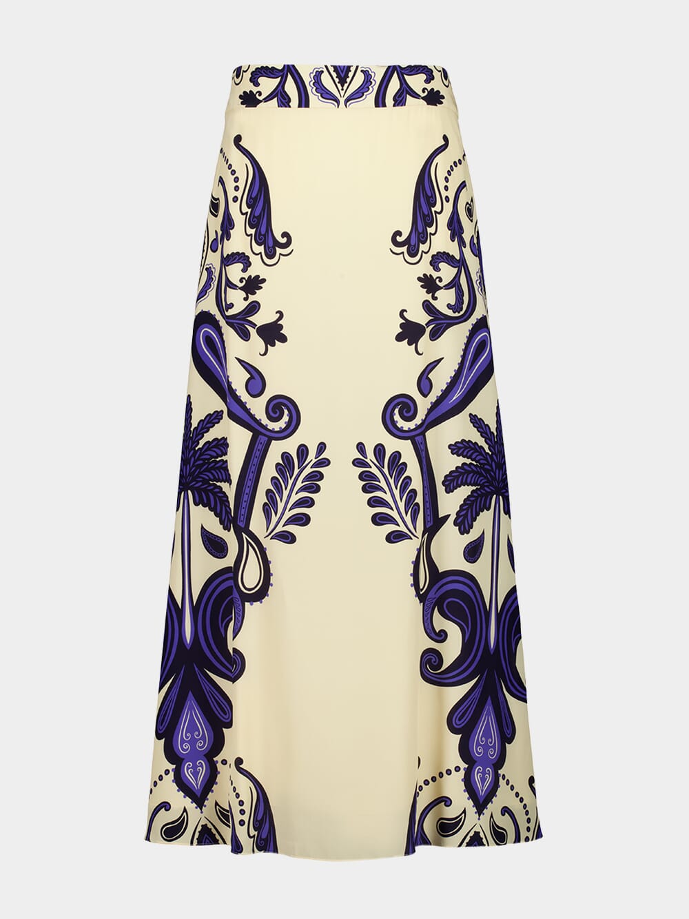 The Ritmo Sol Top is a luxurious silk blouse in an ecru and navy palette, designed with voluminous sleeves and a fluid, relaxed silhouette that drapes effortlessly. The elegant open front and back-tie closure lend an elevated touch to this easygoing yet refined piece. Pair it with the matching skirt from the collection for a striking coordinated ensemble.