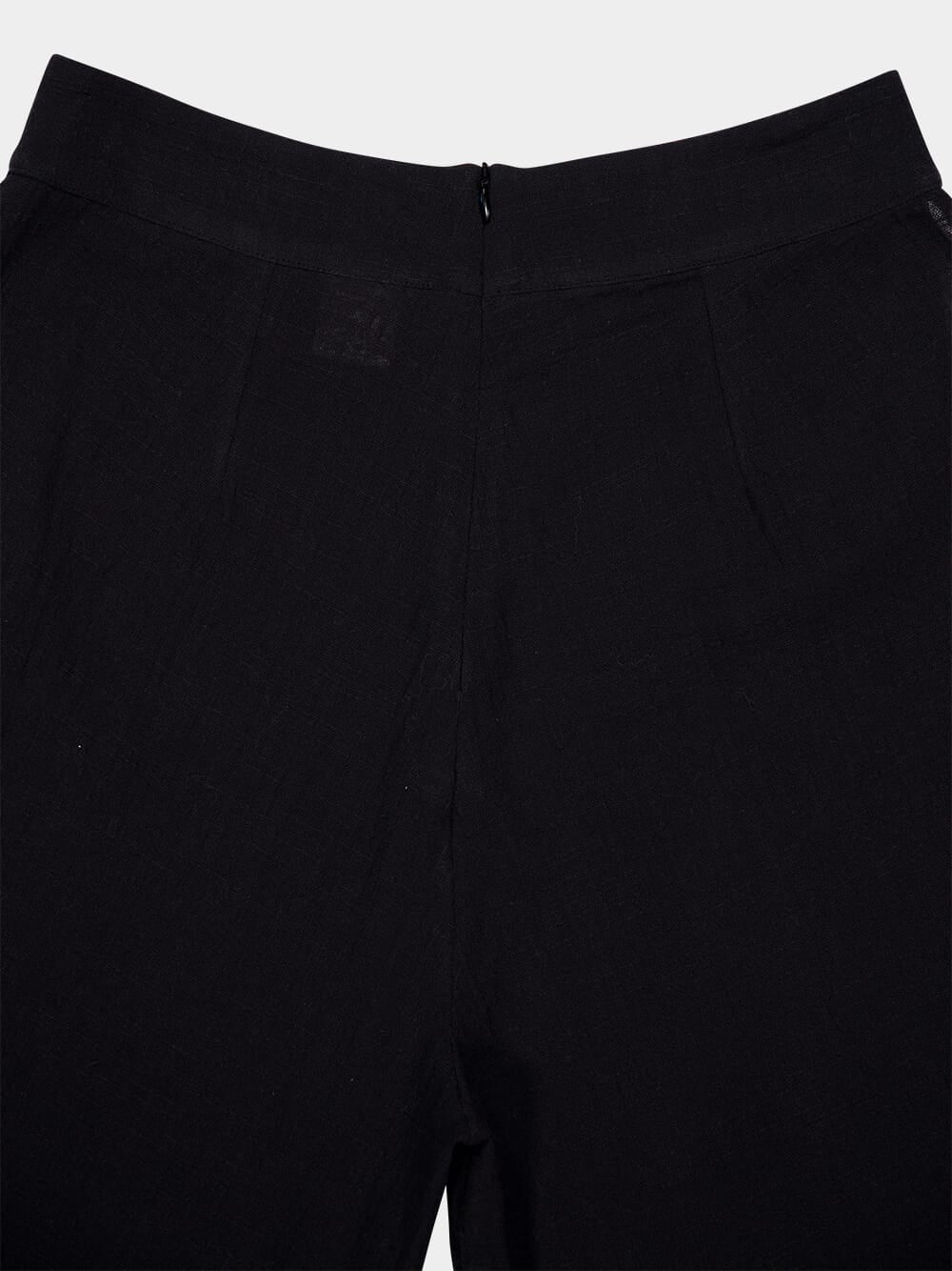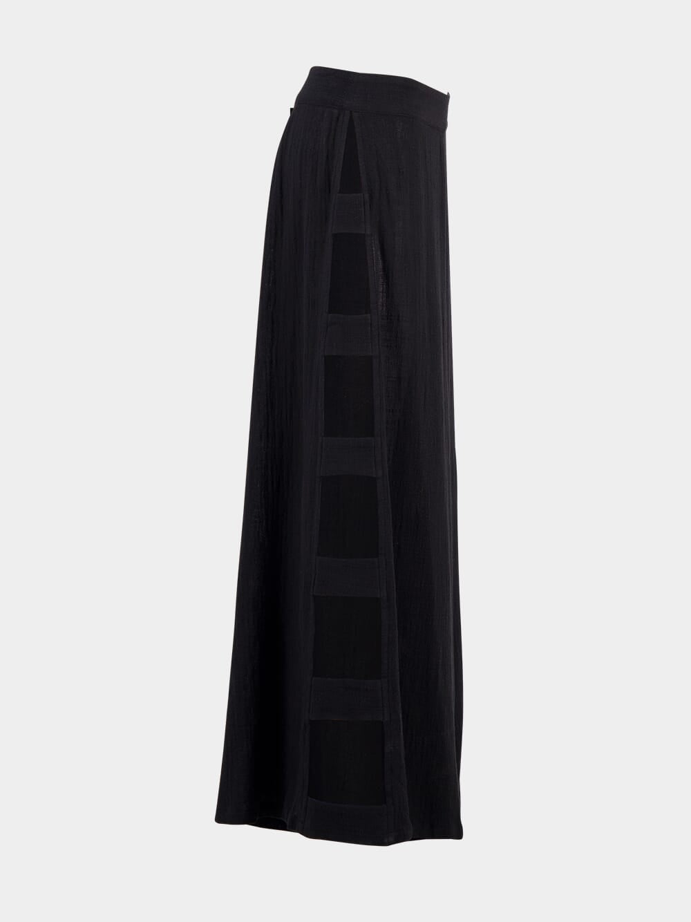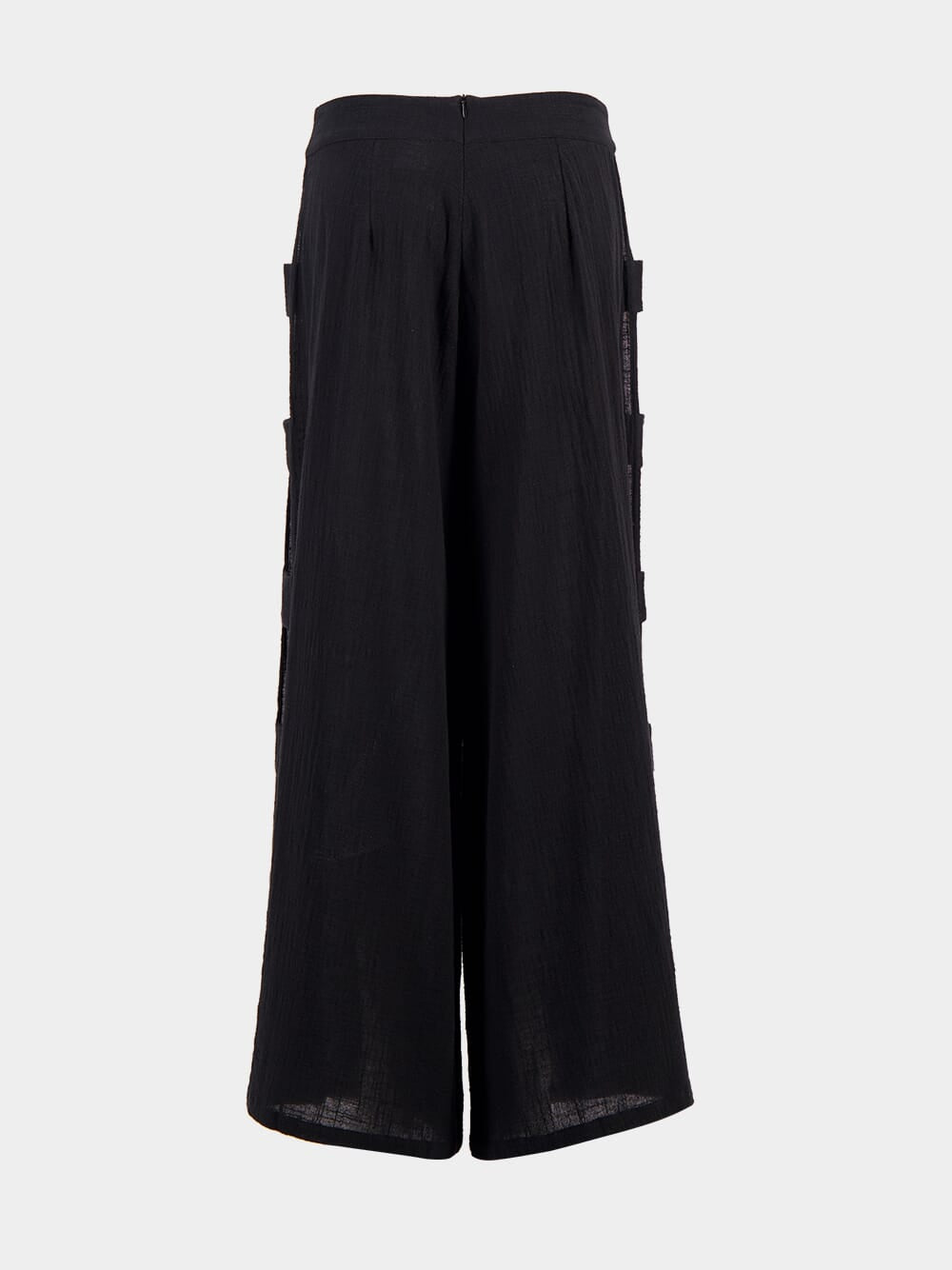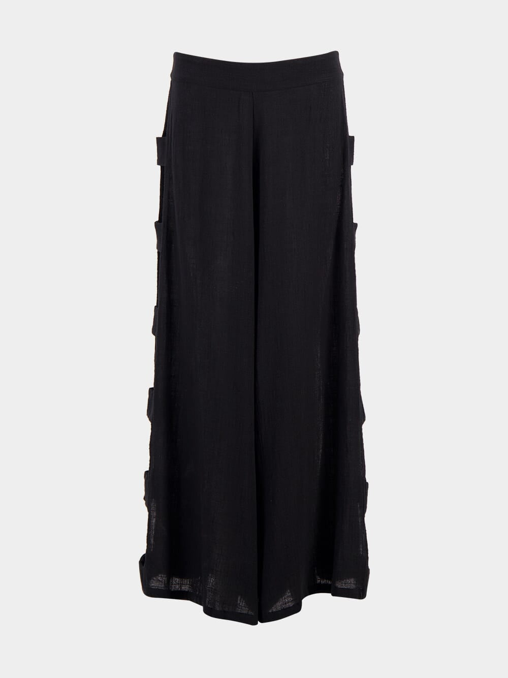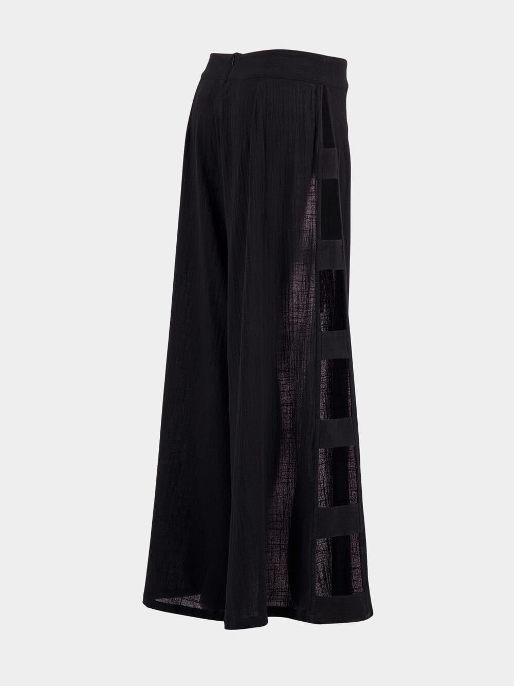 These black pants feature stylish cutout sides, adding a unique touch to your wardrobe. Made from high-quality cotton, they provide both comfort and elegance. The wide-leg design offers a sophisticated silhouette, perfect for both casual and formal occasions.
