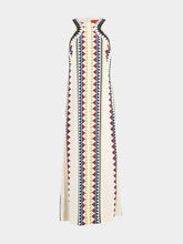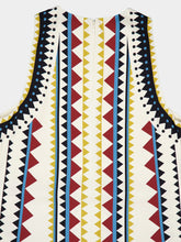 The Doric Placée Racer Dress in cream satin embodies elegance and modernity. Designed in a column shape that hits at the ankle, this dress features a distinctive racer back neckline and a sleek silhouette. Crafted from luxurious satin, it showcases a vibrant geometric print in bold colors. Practicality is enhanced with pockets on each side, making it as functional as it is stylish. Perfect for any sophisticated event, this dress is a true statement piece.