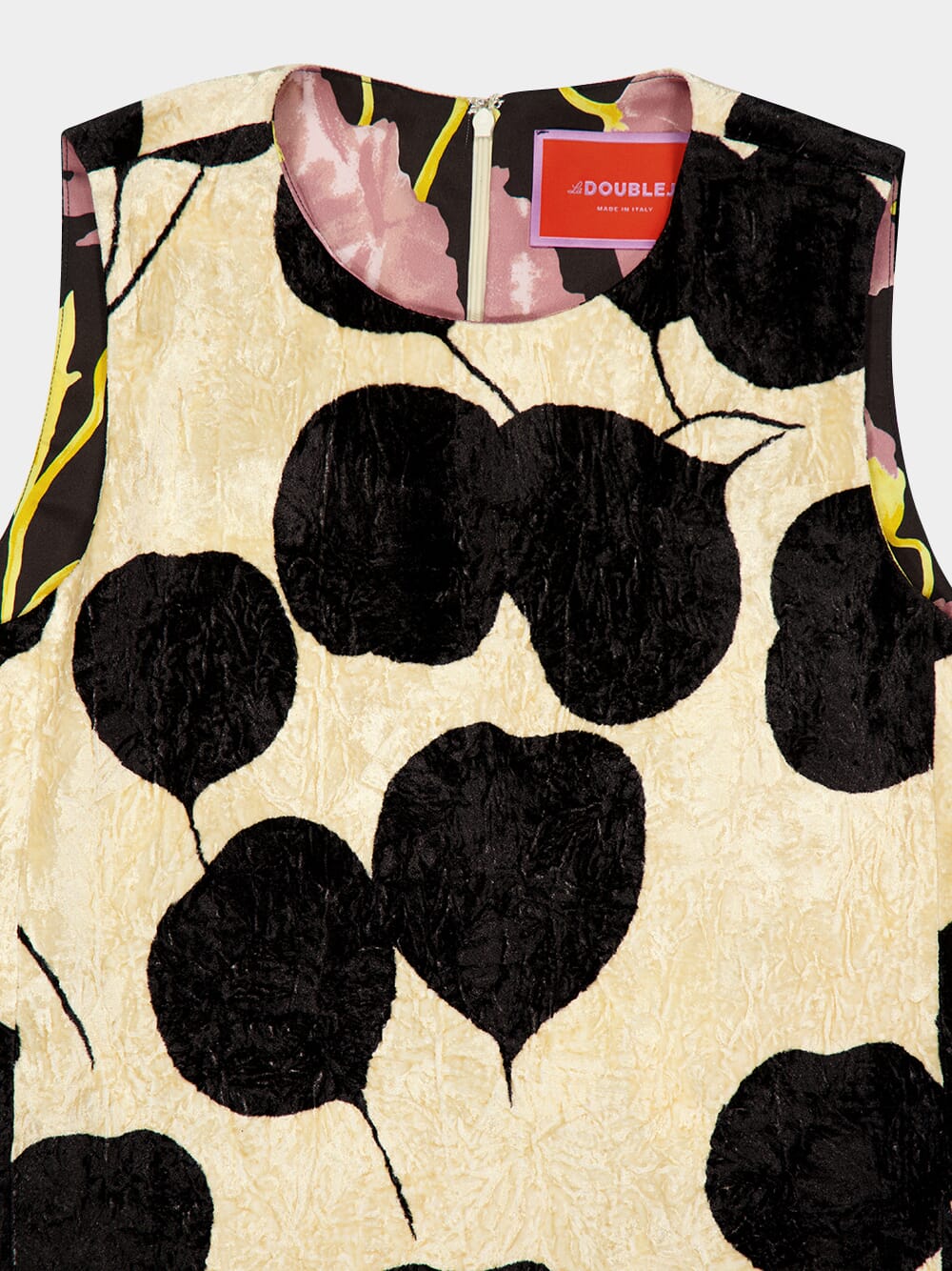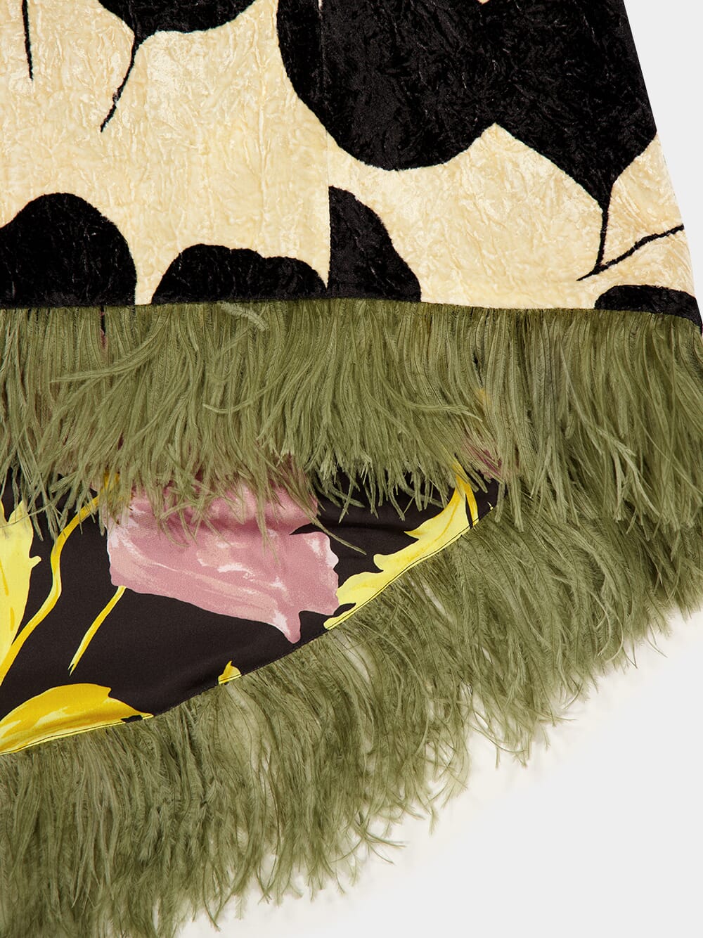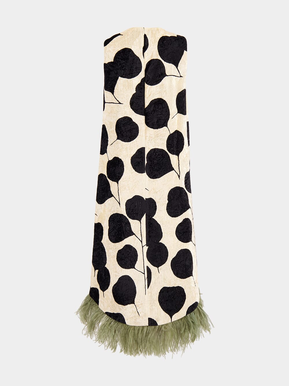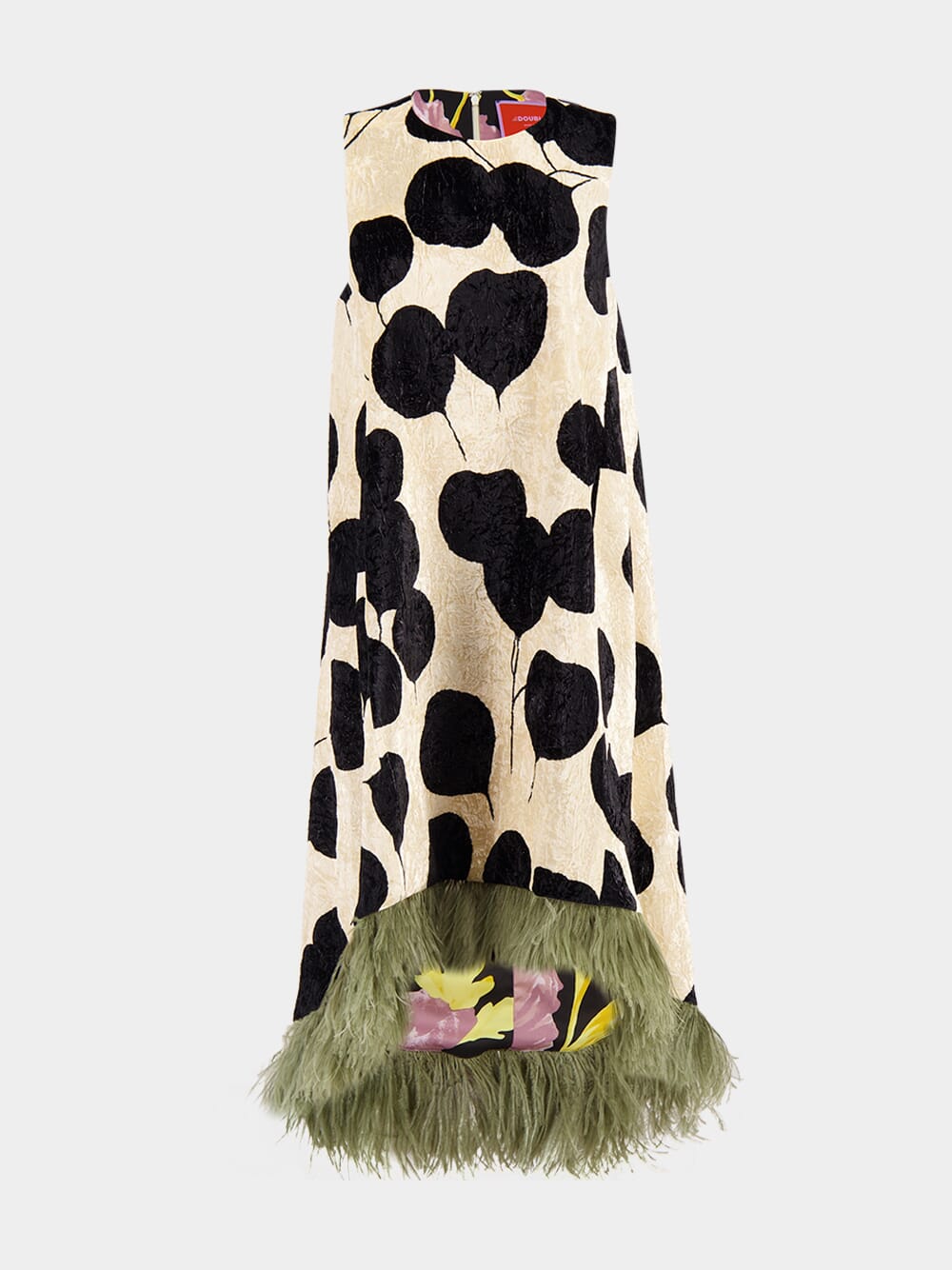 The La Scala High Dress Lunaria combines elegance with playful flair, featuring a bold A-line silhouette crafted from nubby shot cotton for added structure. This Italian-made piece showcases a high neckline and an asymmetric hem adorned with feather detailing in contrasting tones, creating a unique visual appeal. The dress is lined with vibrant colors for extra dimension, offering a striking option for occasions that call for standout style.