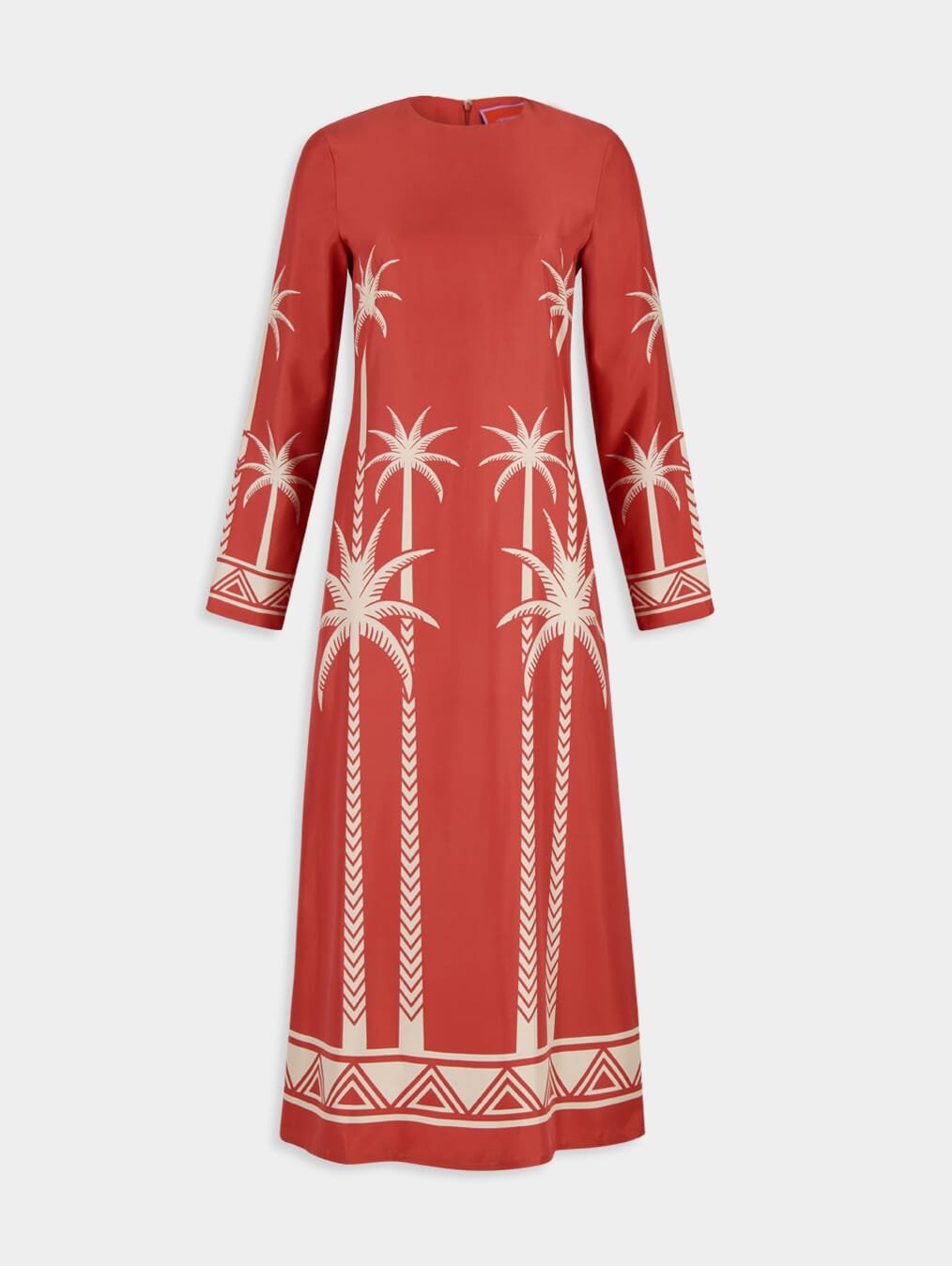 Palm Tree-Print Silk Maxi Dress an A-line dress that embodies the essence of tropical charm. The round neck and long sleeves add a touch of sophistication, while the concealed rear zip fastening ensures easy wear. Embrace comfort and style with the straight hem, creating an ankle-length silhouette that exudes effortless beauty.