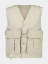 This technical gilet in stone beige is crafted from lightweight VENTILE® cotton, a naturally water-repellent fabric with a soft hand and matte finish. Designed with a utilitarian aesthetic, it features a button-up front, two large pleated patch pockets for added volume, and two zipped pockets with drawcords for enhanced functionality. A D-ring detail allows for key attachment, while the back includes an external grosgrain adjuster for a customizable fit. Fully lined with internal patch pockets, this gilet seamlessly blends practicality with refined craftsmanship, making it an essential layering piece for any season.