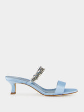 The Kifasan mules in light blue satin exude graceful sophistication with a modern flair. Featuring a crystal-embellished strap and a soft satin front band, these mid-heel mules offer both comfort and elegance. Perfectly poised on a sculpted heel, they add a touch of glamour to both daytime looks and refined evening ensembles. A statement piece crafted for luxurious simplicity.