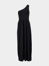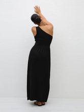 An effortless pull-on one shoulder knit dress. It's bodice is made from bandage knit dry handle viscose for a contoured fit, with a slightly lighter weight crepe knit skirt.