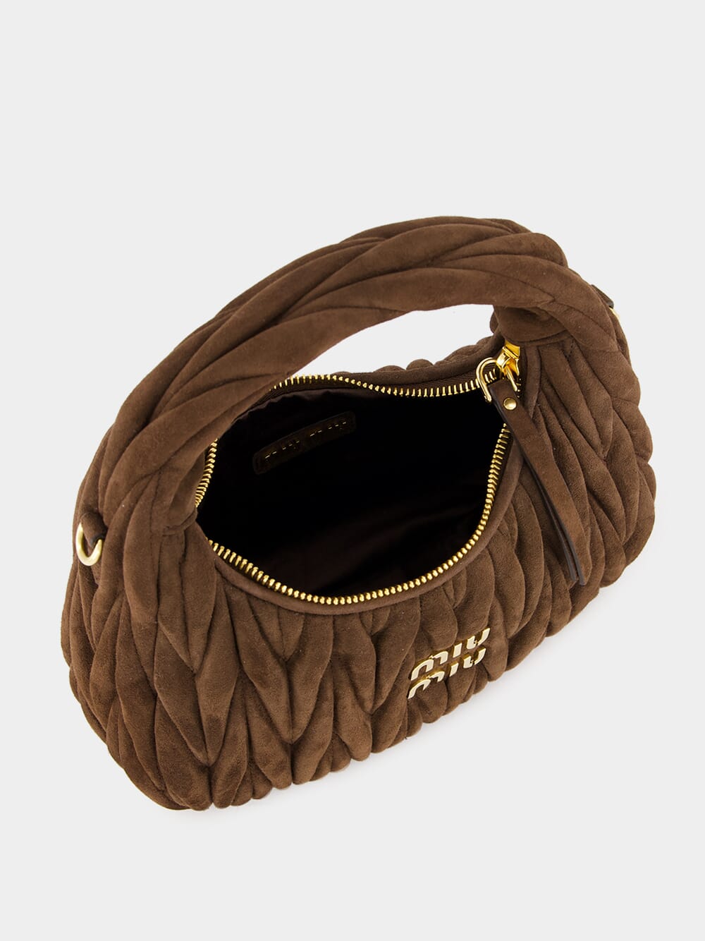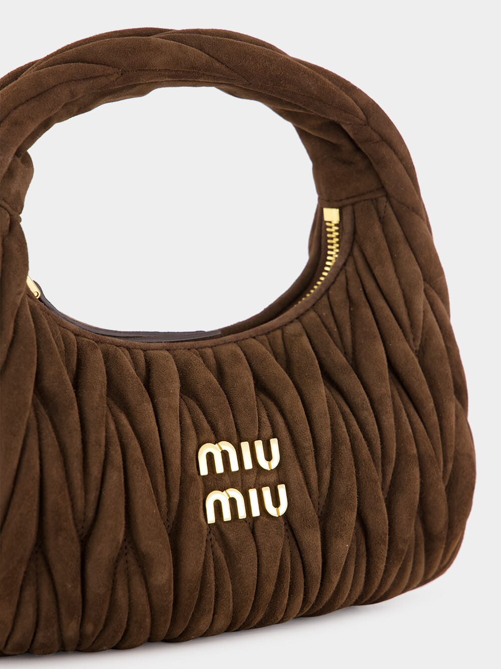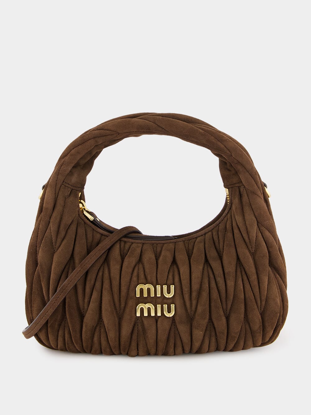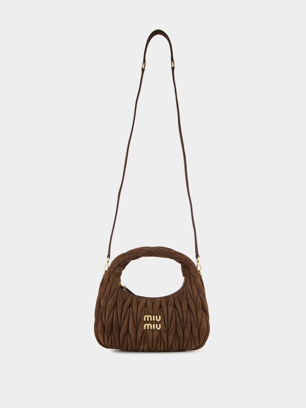 The Wander bag, a seasonal reinterpretation of an iconic Miu Miu piece, crafted from luxurious brown matelassé suede with a sophisticated three-dimensional effect. The hobo style, combining retro inspiration with contemporary elegance, defines modern femininity. Featuring a removable leather shoulder strap, gold-tone hardware, and a metal lettering logo on the front. The bag is finished with a zipper closure and cotton satin lining, making it a stylish and versatile accessory for any wardrobe.