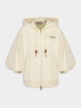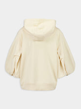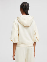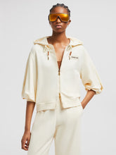 A casual wardrobe essential, this beige zip-up hooded sweatshirt combines comfort and femininity. Crafted from ultra-soft cotton fleece, it features puffed three-quarter length sleeves for a refined touch. The adjustable hood with jersey lining and mesh-lined sleeves enhance breathability and style. Finished with a subtle logo patch, this sweatshirt can be paired with matching bottoms for a coordinated look. A perfect blend of elegance and everyday ease.