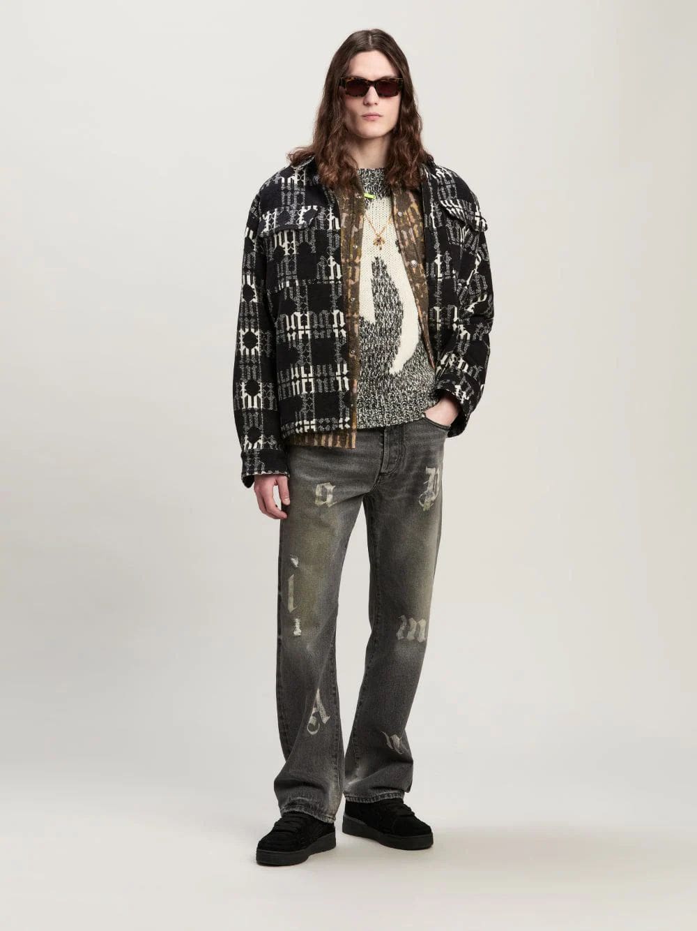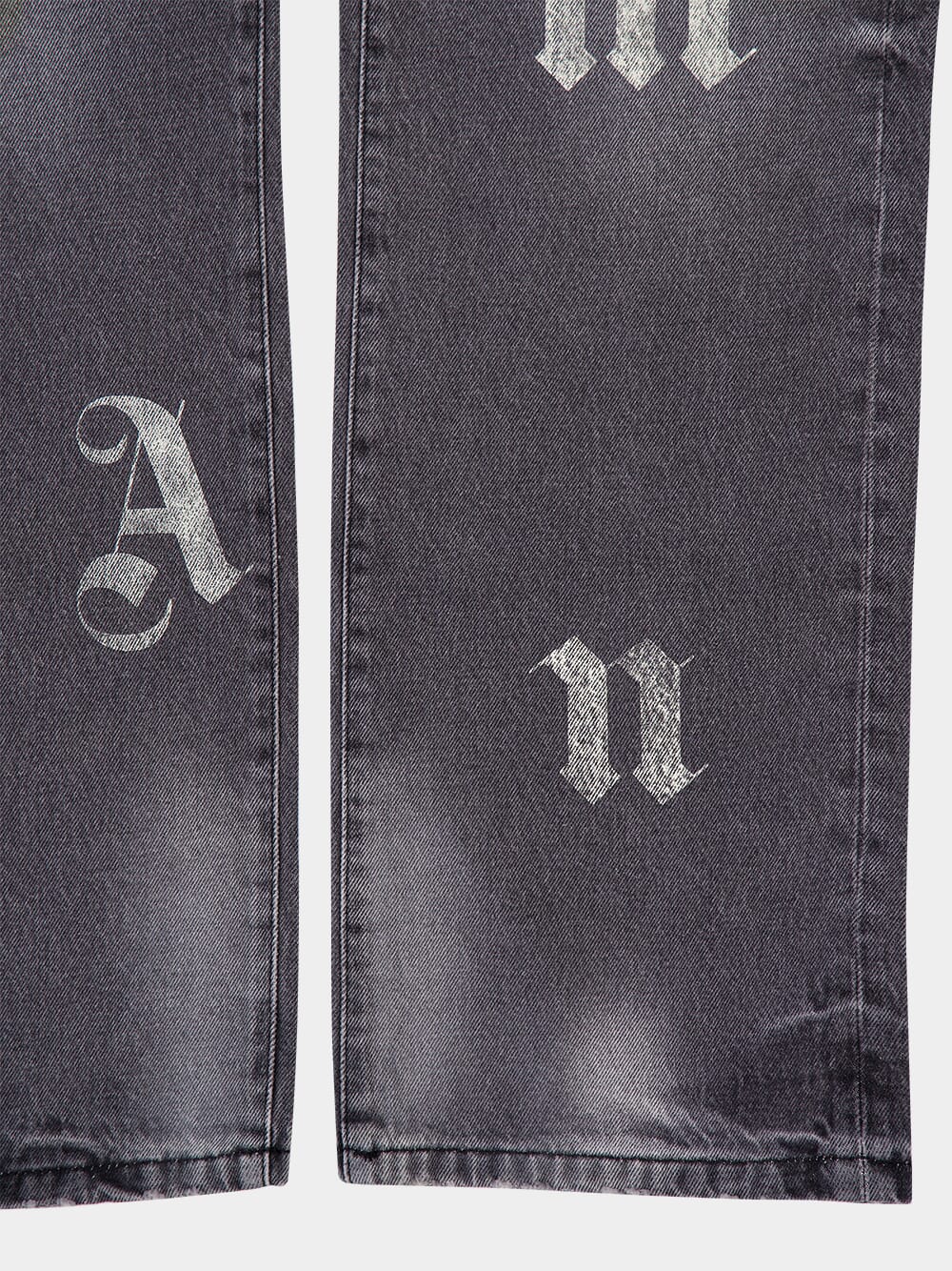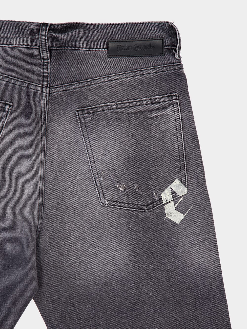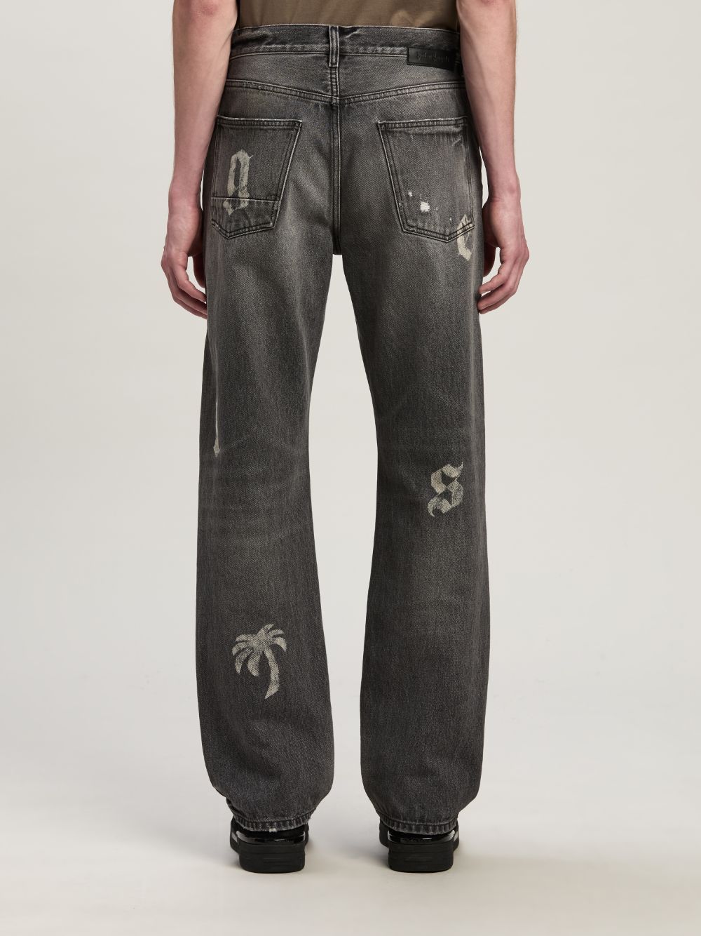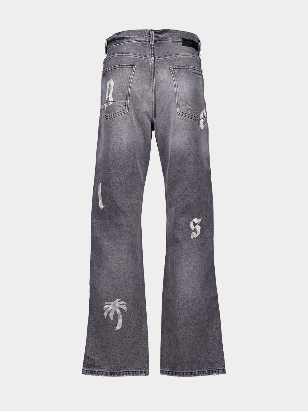 These men's black loose-fit jeans feature a bold, washed aesthetic with ripped details for a distressed look. The standout design element is the printed white Palm Angels logo and palm tree motif on both the front and back, adding a signature touch of urban street style. Crafted from premium cotton denim with leather accents, these jeans blend comfort and edge effortlessly. Ideal for casual and trendy outfits.
