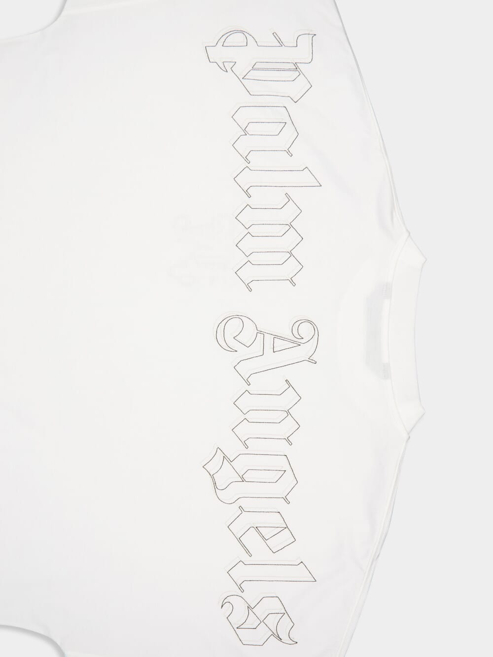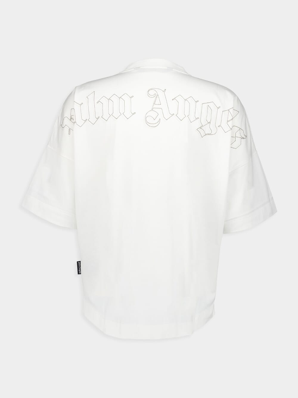 The Embroidered Monogram T-Shirt showcases a perfect blend of classic style and subtle detail. This men's short-sleeved, oversized white T-shirt features a black double-stitched embroidered monogram on the front and a double-stitched embroidered Palm Angels logo on the shoulders. Made from 100% cotton, this T-shirt is ideal for a refined yet casual look, suitable for all seasons.