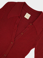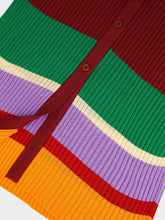 The Fluorite Purple Potion Long-Sleeve Knitted Dress with Buttons is a sophisticated blend of elegance and vibrant design. Crafted from 100% viscose Svilosa yarn, this long dress features a rich burgundy base complemented by multicolor stripe accents at the hem. Its button-down style and fitted silhouette make it ideal for both day and evening wear in cooler months. Made in Portugal.
