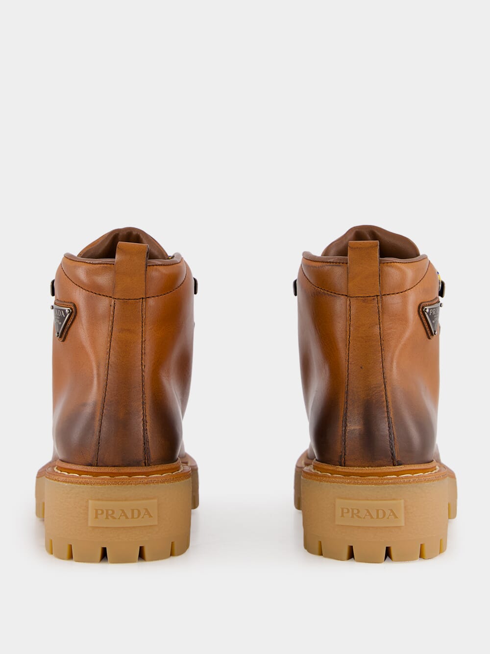These cognac leather booties blend classic hiking boot elements with modern details, adding a sophisticated touch to a sporty design. Featuring metal eyelets and hooks, polyester laces, and an enameled metal triangle logo, these boots are both functional and stylish. With a 45 mm rubber lug tread sole and a removable leather-covered insole, they offer durability and comfort. The leather lining and 11 cm boot leg ensure a secure fit for outdoor or casual wear.