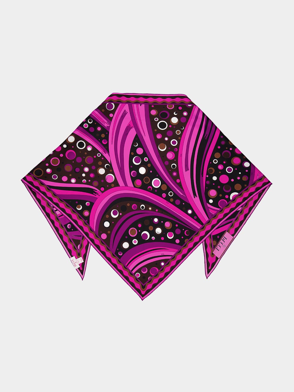 This luxurious silk-twill scarf showcases the vibrant Fontane print, combining dynamic swirls with playful bubble motifs. In hues of fuchsia pink, bright pink, chocolate brown, and black, it offers versatility in styling. Knot it around the neck, wear as a top, or tie to your favorite bag.