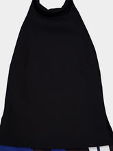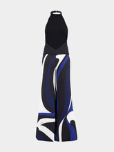 This striking halter-neck jumpsuit features a sleek black top and bold printed wide-leg trousers. Made from a luxurious cady fabric, the jumpsuit offers a modern and elegant silhouette. The vivid blue, black, and white swirling pattern adds a touch of sophistication, making it perfect for any stylish occasion. The wide-leg fit provides comfort and a dramatic flair, ideal for pairing with heels for an elevated look.