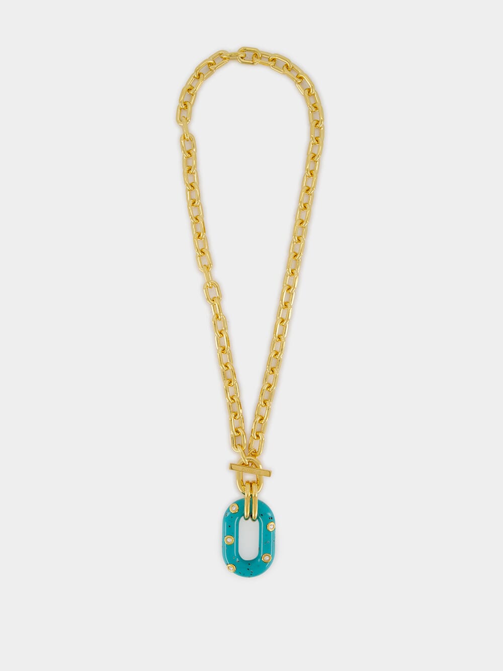 This striking XL Link necklace from Rabanne is crafted with small interlocking gold-tone aluminum links and features an oversized turquoise resin link embellished with sparkling strass. Finished with a T-bar clasp, this Italian-made piece exudes a bold, luxurious appeal, perfect for making a statement with any outfit.