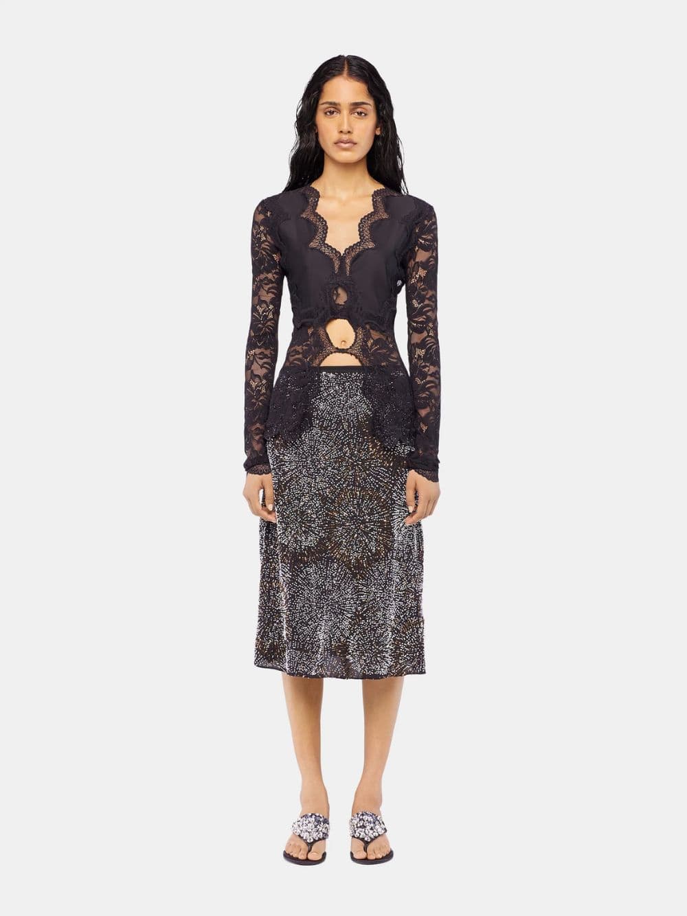 A sophisticated blend of sensuality and elegance, this black midi skirt combines delicate lace with soft viscose jersey for a refined silhouette. Featuring scalloped hems and a figure-enhancing fit, it is crafted from a polyamide-elastane blend for comfort and stretch. Perfect for elevated eveningwear or styled with knitwear for contrast, this skirt embodies feminine allure with timeless appeal.