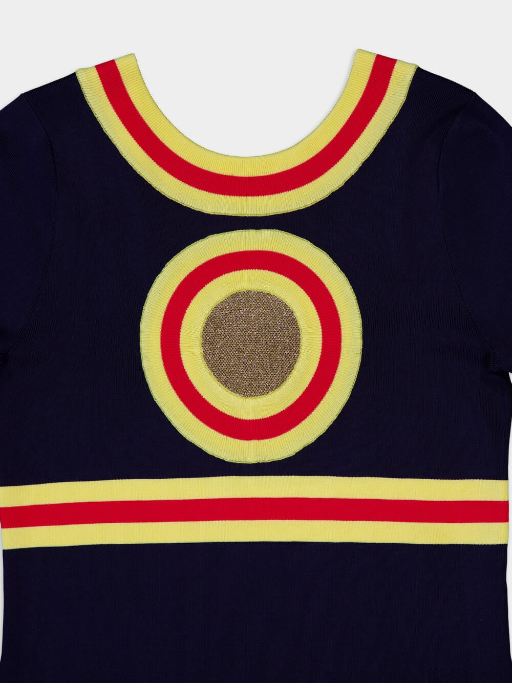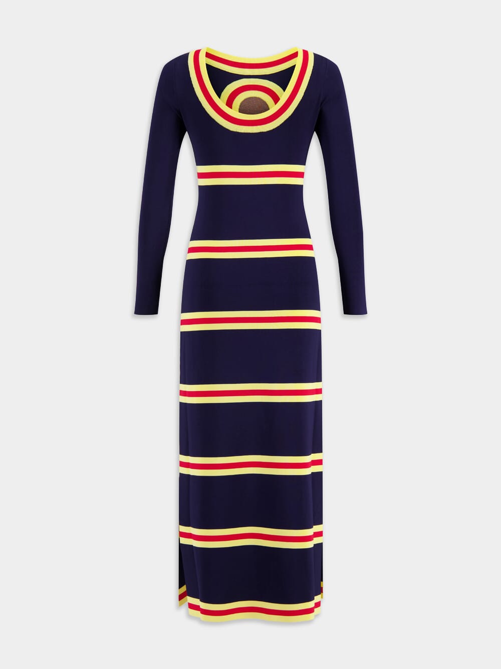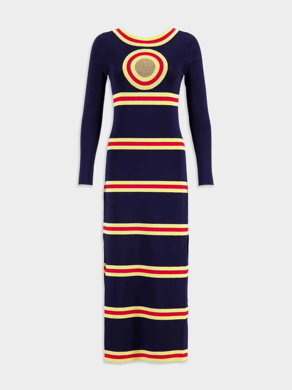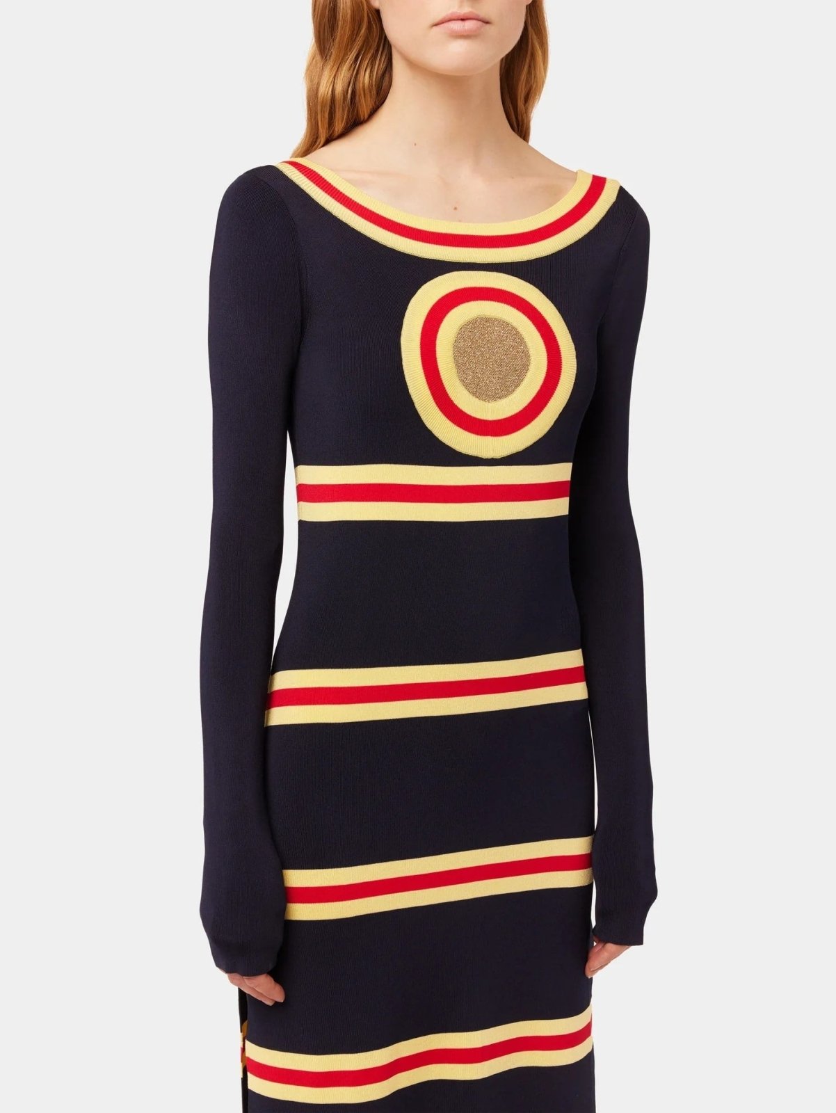 Long dress in lurex knit with geometrical details, a perfect blend of comfort and style. This dress features long sleeves and slits on the sides, allowing for easy movement and a flattering silhouette. Composed of a back neckline and a captivating play of geometrical stripes with shimmering lurex details, it adds a touch of sophistication to your ensemble.