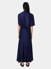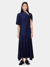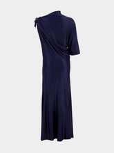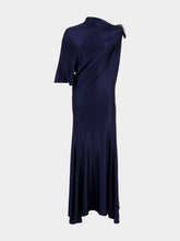 This navy asymmetrical long dress showcases effortless elegance and modernity. Crafted from soft viscose jersey, it features a stand collar, short sleeves, and an ankle-length hem for a graceful silhouette. The silver signature buckle at the neckline adds a touch of sophistication, while the asymmetrical design brings a contemporary edge. Perfect for evening events or refined daytime occasions, this dress combines comfort and style seamlessly.