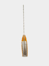 The Round 1969 Resin Disc Bag in Orange Gradient by Rabanne reimagines the brand’s iconic craftsmanship in a sculptural circular silhouette. Hand-assembled from interlinked acetate discs, this radiant piece transitions through warm orange tones in a sun-drenched gradient, bordered by polished silver-tone discs for a bold finish. The structured round shape is suspended from the signature silver double chain strap, offering a striking blend of modern geometry and retro allure. Secured with a discreet magnetic closure engraved with the Rabanne logo, this collectible piece is both a visual statement and a testament to artisanal construction.