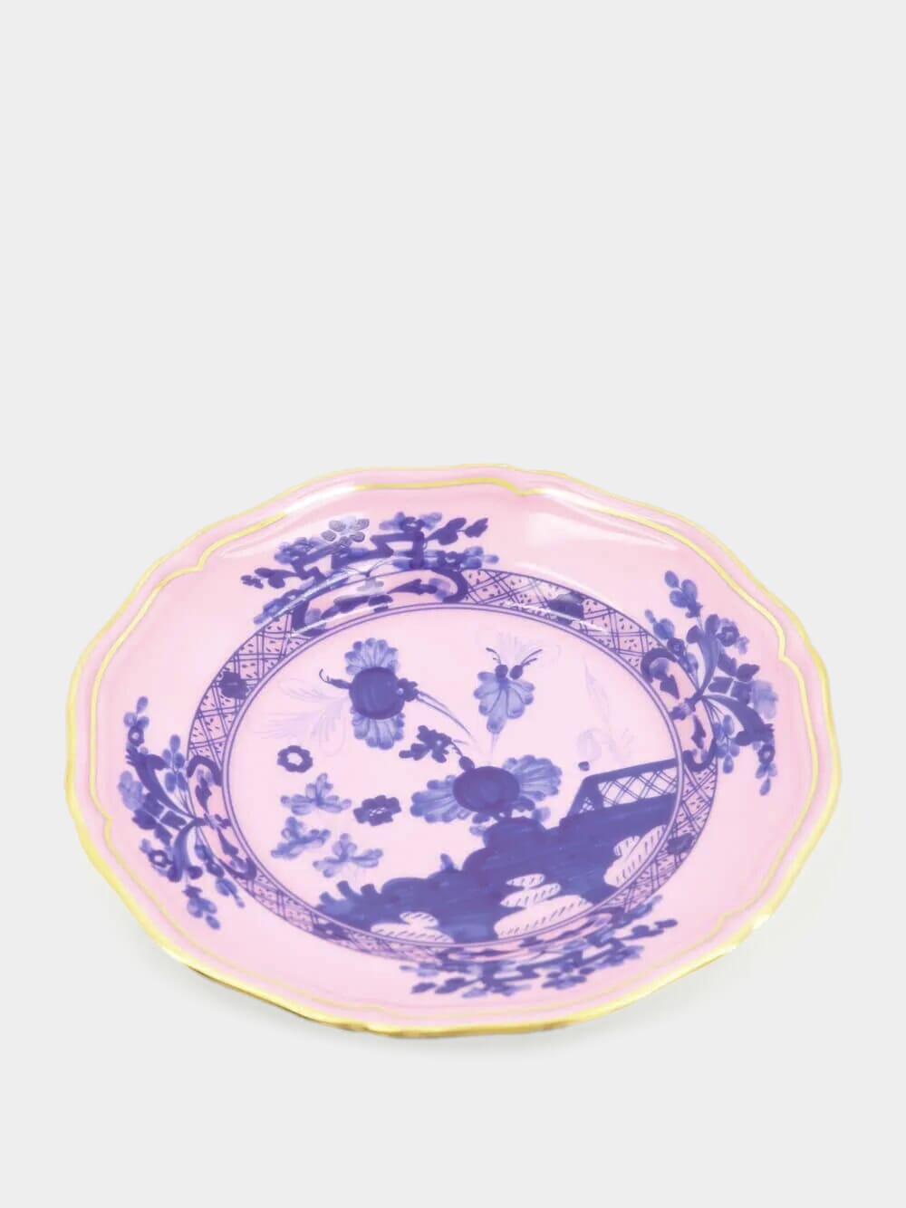 Oriente Italiano Azalea bread plate by Richard Ginori, a true testament to the art of porcelain, meticulously handcrafted and adorned with intricate designs and threading in gold, this bread plate captures the essence of Richard Ginori's heritage. With its impeccable quality and timeless beauty, it effortlessly adds a touch of sophistication to your dining experience.