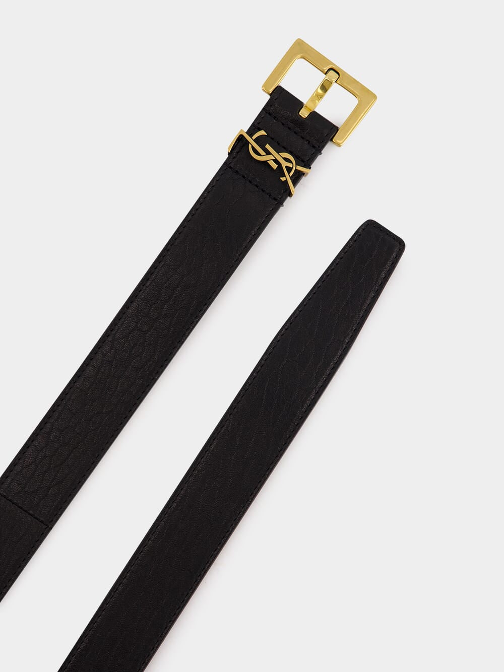 Elegant belt crafted from black grained lambskin leather, featuring an adjustable square buckle and a signature Cassandre loop. The belt is adorned with bronze-toned hardware and an adjustable buckle closure, providing a refined and timeless look. With a width of 3 cm, this versatile accessory adds a touch of sophistication to any outfit.