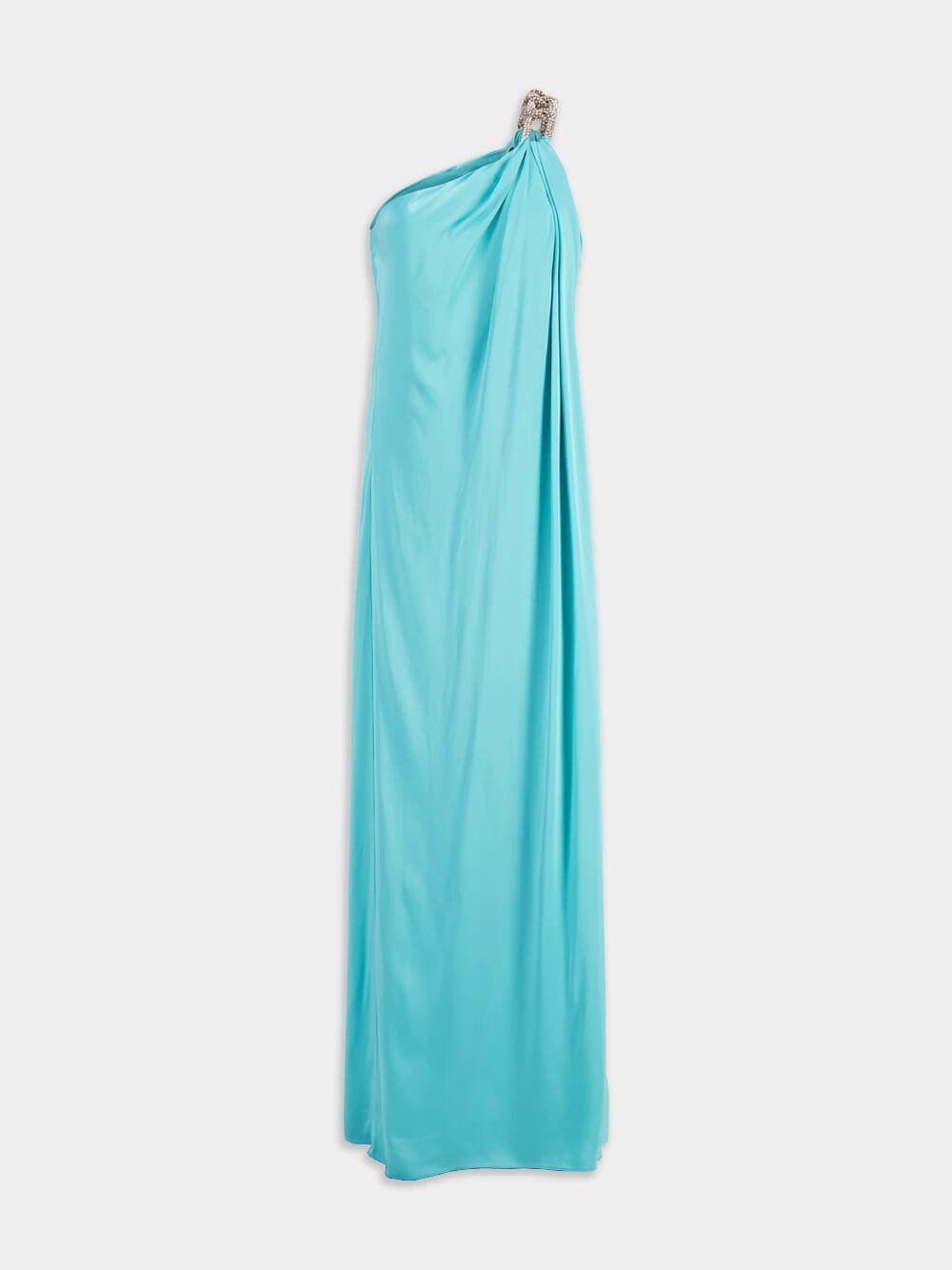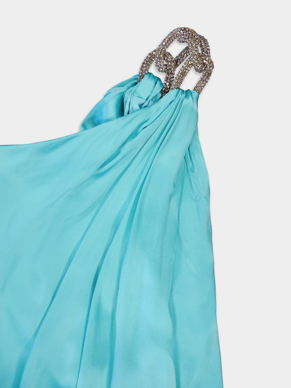 STELLA MCCARTNEY Chain Embellished One Shoulder Dress, a stunning and glamorous garment in captivating blue. This dress features a chic one-shoulder design with chain embellishments, adding a touch of sophistication and edge to your look. Crafted with meticulous attention to detail, it offers a flattering fit and exquisite craftsmanship.