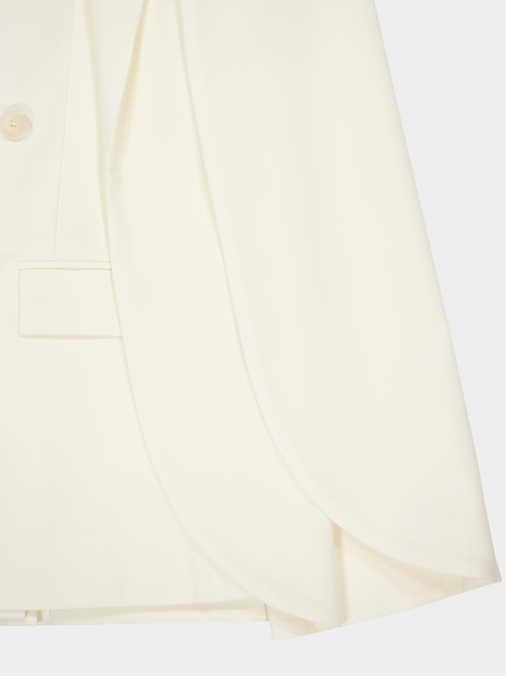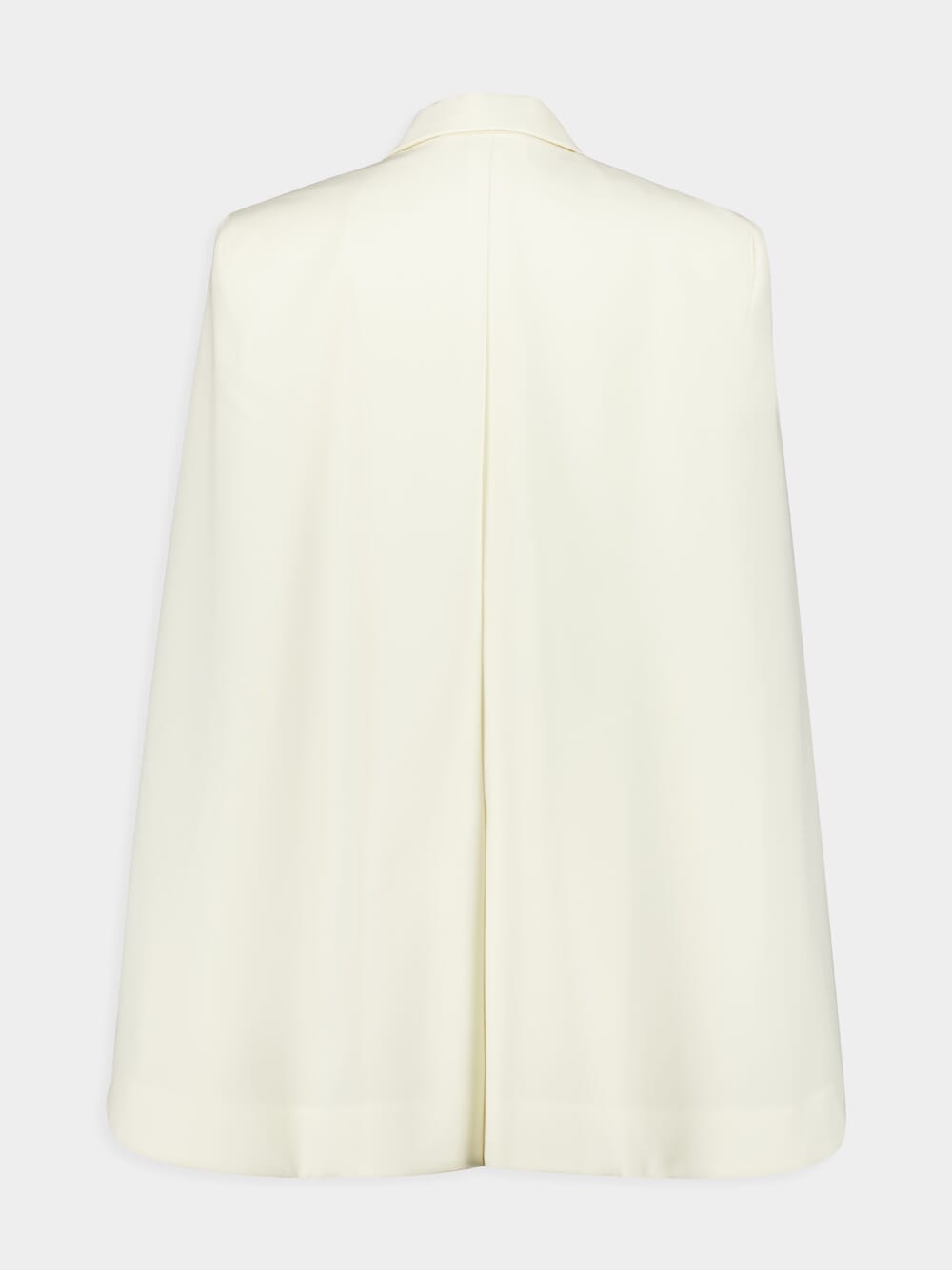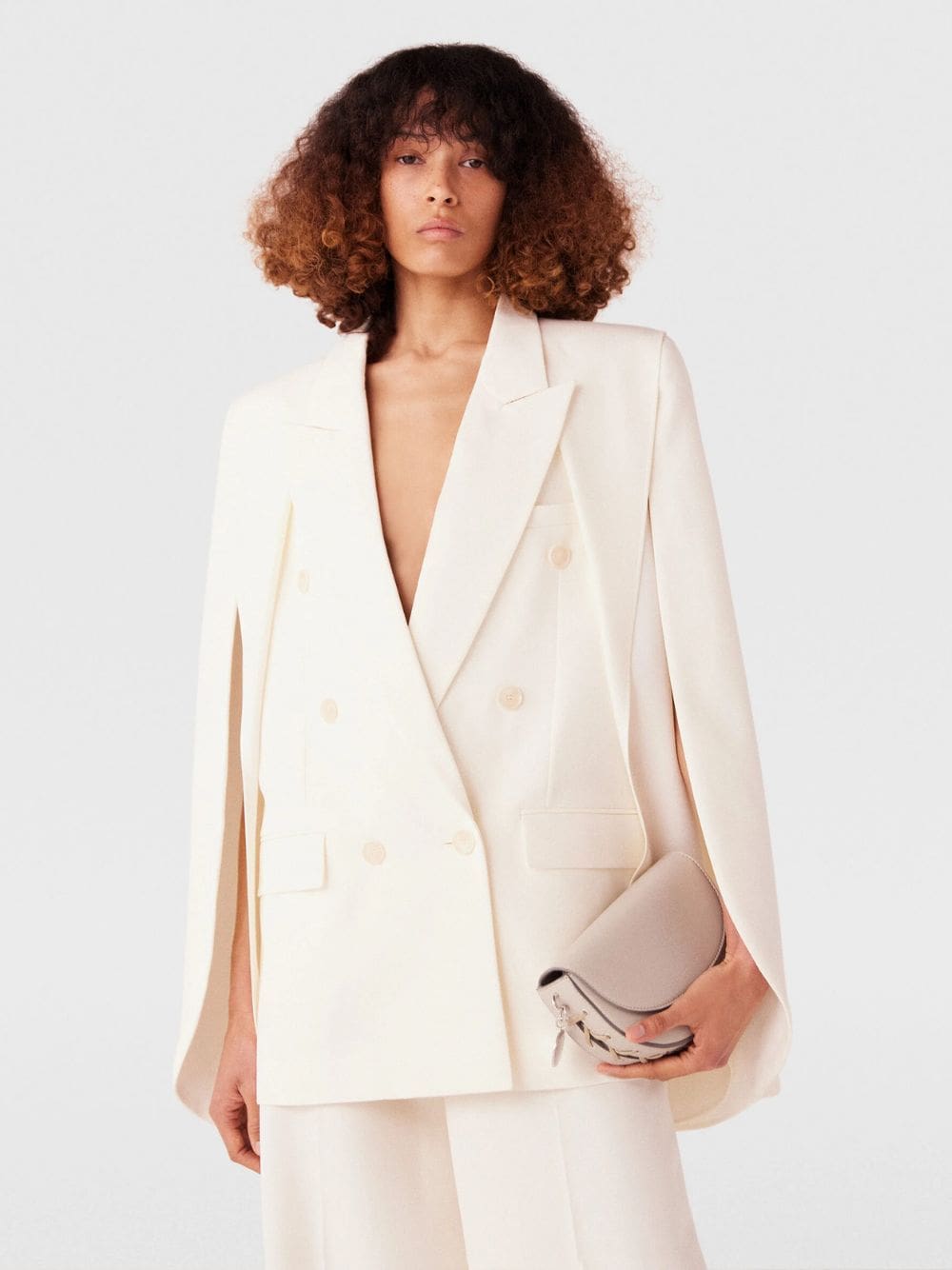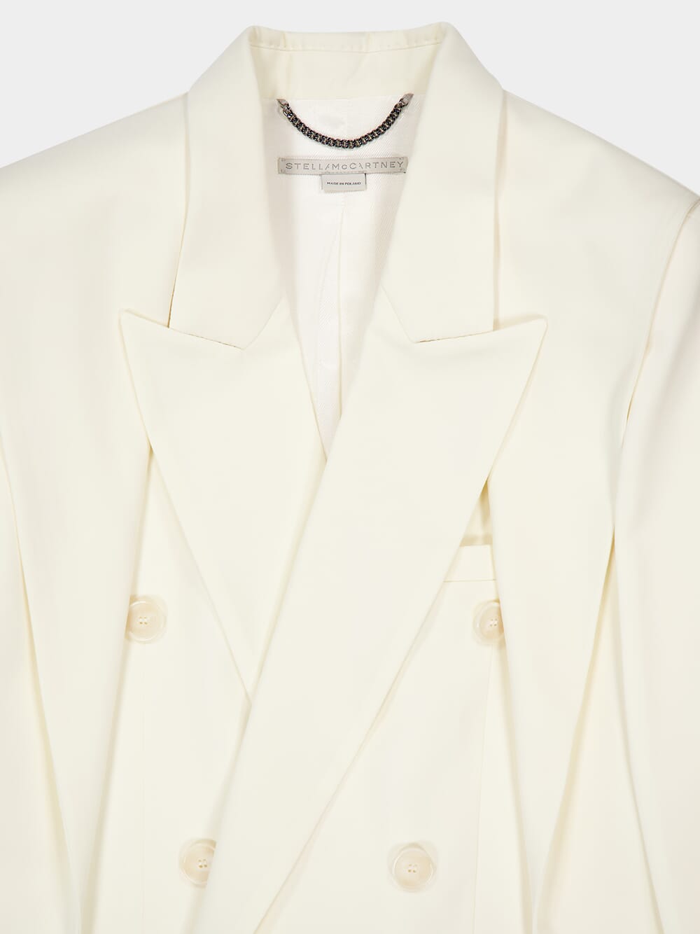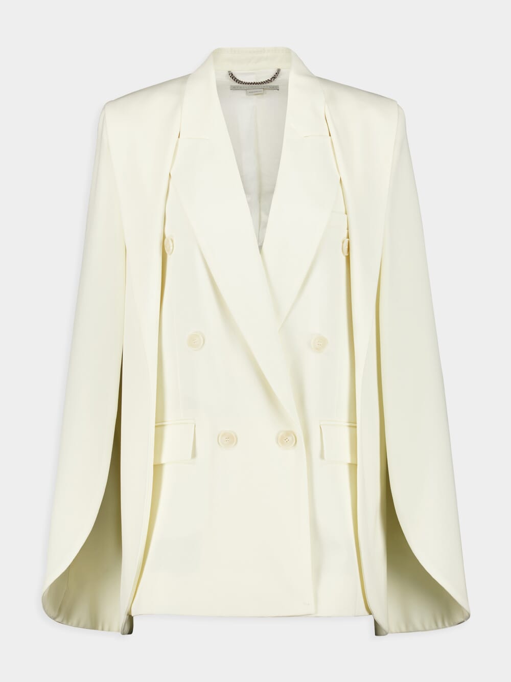 This elegant double-breasted blazer in pure white showcases Stella McCartney’s impeccable tailoring. Made from soft, RWS-certified wool, it features a boxy silhouette with unique cape-like sleeves that drape beautifully at the back. Designed with peak lapels and tonal buttons, it includes two front flap pockets and buttoned cuffs. Perfect for creating a statement look when paired with matching trousers, this blazer is a sophisticated blend of classic and contemporary style.
