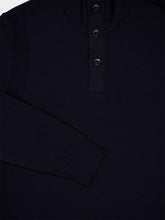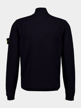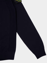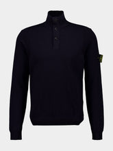This navy jumper from Stone Island is crafted in stretch RWS-certified virgin wool for optimal comfort and responsible sourcing. Featuring a half-button placket with a stand collar and detailed with reverse stitch accents along the shoulders and seams, it combines refined texture with classic utility. Finished with ribbed trims and the iconic badge on the left sleeve. A timeless staple in a 12-gauge stocking stitch knit.