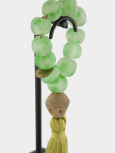 This unique 33cm artwork blends cultural heritage with refined artistry. Composed of hand-crafted green recycled glass beads by the Krobo tribe of Ghana and a rare bronze piece from Nigeria’s Hausa tribe, it is completed with a silk thread and mohair wool tassel. Set on a minimalist black metal stand, this creation by Studio Julia Atlas offers a sculptural presence that infuses interiors with symbolic depth and a touch of global elegance.