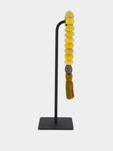 A beautiful creation from Studio Julia Atlas, this prayer bead artwork exudes warmth and elegance. Crafted with man-made amber beads, antique bronze accents, and finished with a luxurious silk tassel, this piece is thoughtfully designed to enhance any interior. Its soft light yellow tones bring a sense of calm and serenity, while the intricate craftsmanship celebrates artistry and heritage. Perfect for display on a stand, it combines silk and cotton elements, creating a tactile and visual masterpiece. An extraordinary decorative piece that elevates any space with timeless charm. Includes Metal Display.