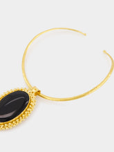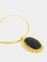 This luxurious gold necklace features a bold black onyx pendant set in an intricate gold frame. The striking contrast between the deep black stone and the radiant gold setting adds a touch of sophistication and elegance to any outfit. Perfect for formal occasions.