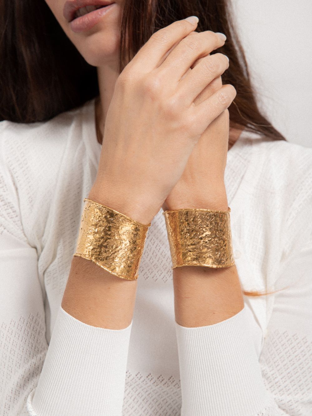 The Gold Flow Textured Cuff Bracelet is a bold statement piece crafted from golden brass with an artisanal hammered finish. This wide cuff features a rich, textured design that adds depth and character, perfect for elevating both casual and formal looks. The open design allows for easy wear, while the golden tones bring warmth and sophistication to any outfit. Ideal for adding a touch of luxury and elegance, this cuff is a must-have accessory for those who appreciate unique, handcrafted jewelry.