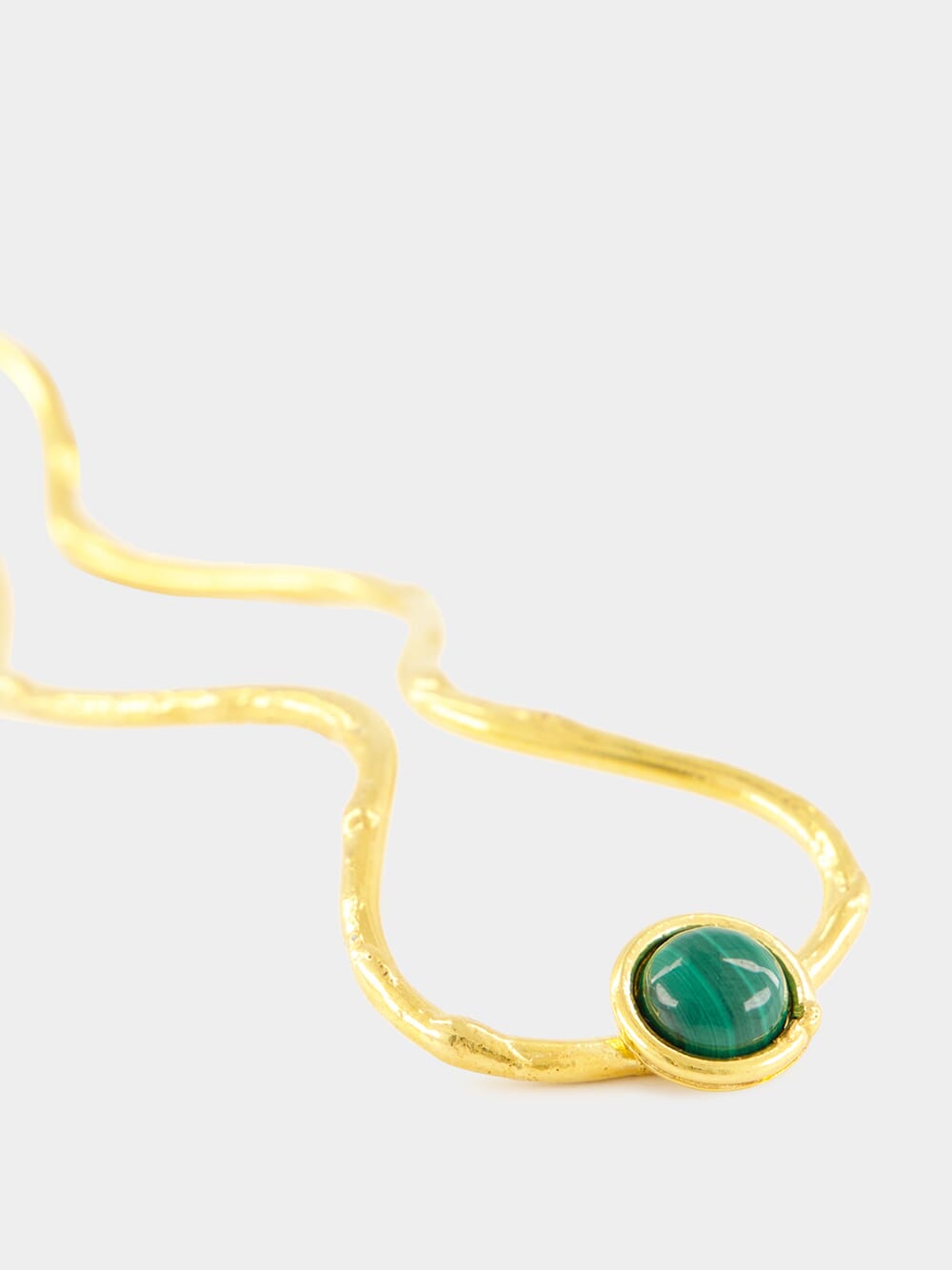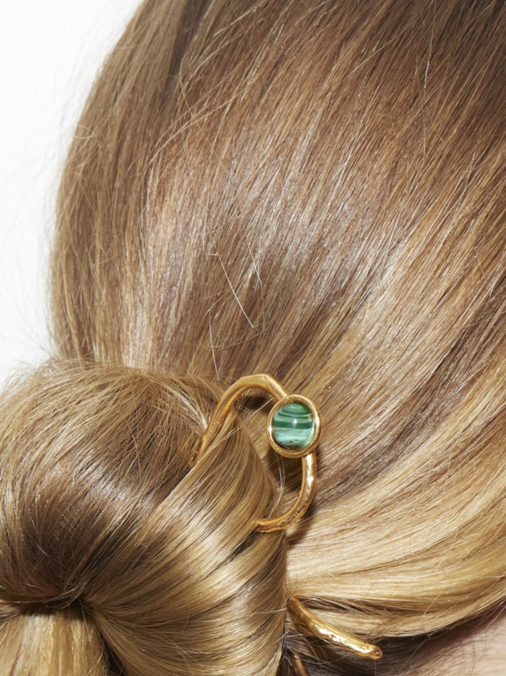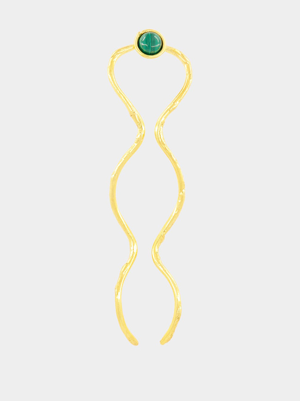This elegant "Wave" hair pin brings a sophisticated touch to your hairstyle, crafted from golden brass and accented with a polished malachite stone. The fluid, wavy design gracefully contours, creating a harmonious blend of minimalist form and natural beauty. Perfect for adding a unique statement to any look, this piece is versatile enough to be worn casually or with evening wear, providing a refined aesthetic with a hint of glamour.